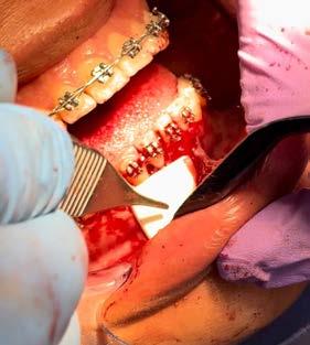 y en forma local se realiza incisión marginal con descarga lineal para levantar un colgajo seminewman, ostectomía y osteotomía para liberar el órgano dentario retenido y así facilitar la extracción (Figura 3), una vez fuera de boca se realiza tratamiento de conductos y obturación, a la par de esto se realiza extracción atraumática del órgano dentario 73 (Figura 4) y preparación alveolar del lecho receptor para recibir el órgano dentario a trasplantar bajo parámetros quirúrgicos. Enfatizando la mínima manipulación a nivel de los tercios radiculares del órgano dentario a trasplantar intentando preservar en lo posible las fibras del ligamento periodontal, manteniendo en todo momento condiciones de hidratación a base de agua bidestilada durante su preparación y sustitución neurovascular en su forma extrabucal, así como a nivel de los lechos receptores bajo protocolo bacteriostático y bactericida no quelantes (Figura 5).