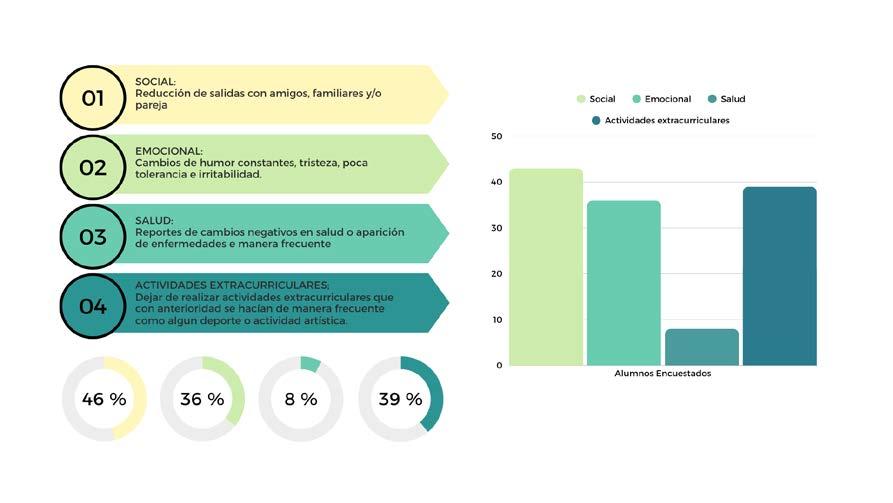 Asimismo, 46% de los alumnos señaló que el aspecto más afectado de su vida fue el social, al limitar su convivencia con familiares, amigos y pareja. En el ámbito emocional, se observaron cambios de humor frecuentes y menor tolerancia. Otro grupo de estudiantes mencionó que, debido a lo