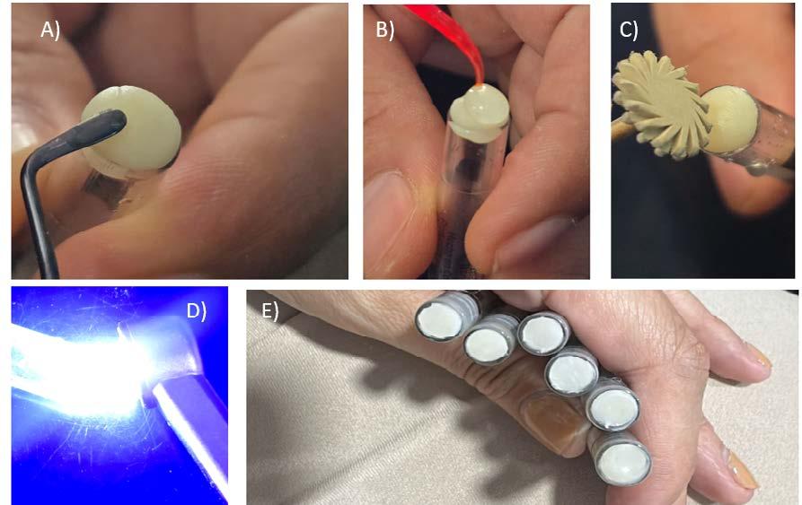 Figura 1. Preparación de muestras de resina compuesta. A) Empacado de resina en tubo anestésico. B) Colocación de glicerina. C) Aplicación de pulido. D) Fotocurado de la resina. E) Resultado de muestras.