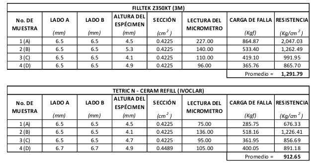 Al comparar los grupos de la resina 3M®, se observó que la muestra B (con glicerina) obtuvo una resistencia 62.14% superior a la del grupo control (A). Los valores detallados se presentan en la Tabla 2.