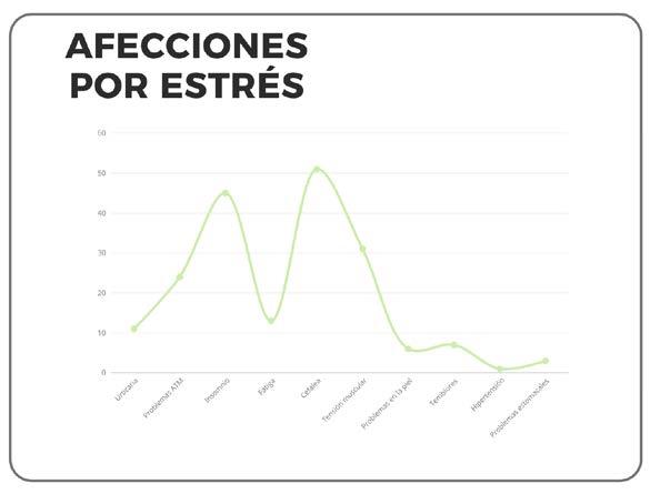 En cuanto a los síntomas físicos, el malestar más reportado fueron las cefaleas, presentes en 62% de los casos, seguidas del insomnio en 45%. Otras afecciones mencionadas incluyeron tensión muscular en hombros, bruxismo, colitis nerviosa, somnolencia, temblores, sarpullido, urticaria y, en menor medida, hipertensión arterial (Figura 2). Además, 50% de los estudiantes refirió dormir en promedio entre 5 y 6 horas diarias, lo que refuerza la presencia de un descanso insuficiente.