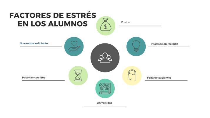 El principal factor de estrés fue la atención a pacientes, con 47 votos, ya que en Odontología gran parte de la calificación depende directamente de las prácticas clínicas. Esto genera ansiedad por la cantidad de trabajos a entregar desde los primeros semestres. Sin embargo, no se considera una limitante, pues dichas prácticas son indispensables para el desarrollo profesional del estudiante. En menor proporción, los alumnos señalaron los altos costos del material e instrumental, así como la sobrecarga de información teórica impartida en clase (Figura 3).