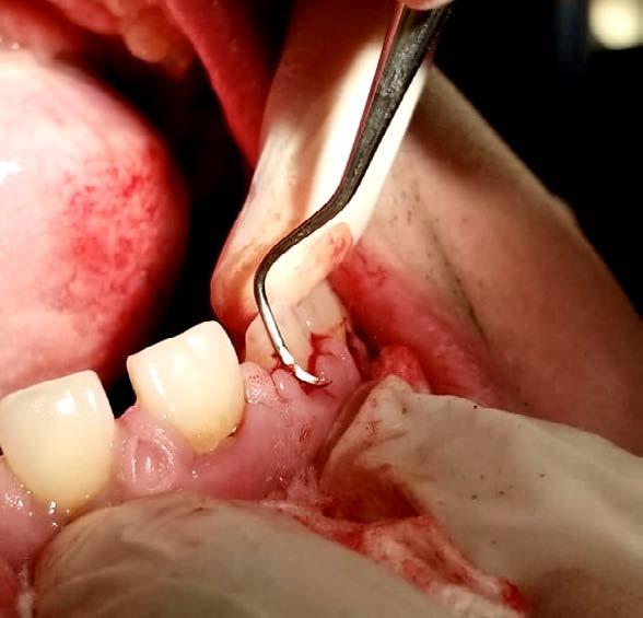 Posteriormente se abordó la fase quirúrgica: se realizaron las extracciones de los órganos dentarios sin posibilidad de mantenerse en función en boca, se efectuó el legrado alveolar para retirar tejido infectado, además de realizar la exéresis del tejido hiperplásico, y regularización ósea para posteriormente producir la sinéresis de los tejidos a través de una sutura continua simple con sutura absorbible Vicryl 3-0 (Figura 7).