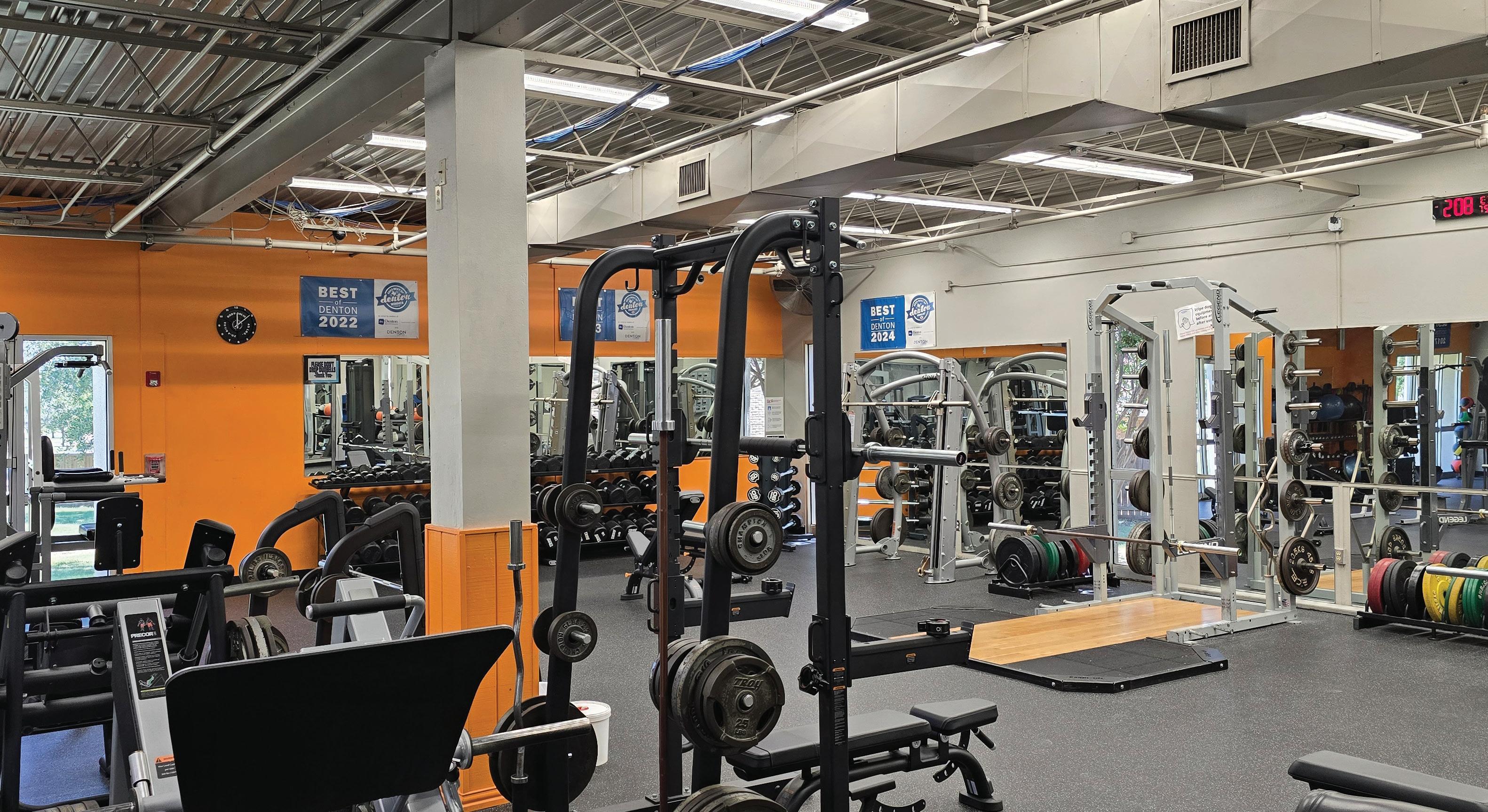 The cardio fitness equipment room features treadmills, elliptical trainers, recumbent bikes, stair master, and a rowing machine. The weight room features Precor and commercial-grade strength training machines, Olympic weight bars, free weights, power racks, a smith machine, cable pulls, and incline and flat weight benches.