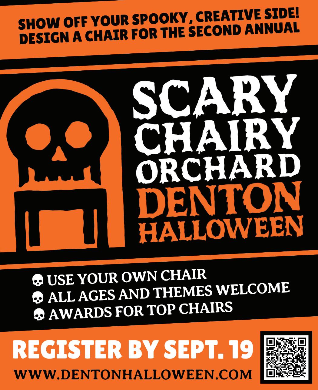 As part of our month-long, citywide Halloween initiative, Keep Denton Beautiful and the City of Denton invite you to redesign and upcycle chairs into Halloween-themed art objects to be featured as part of our Scary Chairy Orchard. The Scary Chairy Orchard will pay tribute to the original Chairy Orchard and be an ongoing exhibit for years to come during Denton’s 31 days of Halloween. The Scary Chairy Orchard will feature individual chairs designed and decorated by community members in the theme of Halloween. For additional information and to register, visit www.cityofdenton.com/scarychairy.