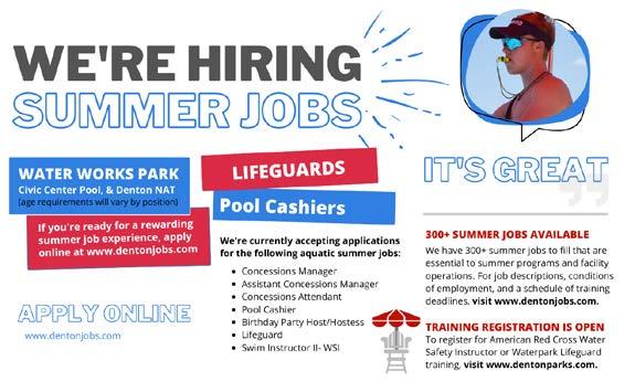 KIDS SUMMER HIRING FOR CAMP STAFF SPRING BREAK & SUMMER WWW.DENTONJOBS.COM STARTING PAY $15/HR LOCATIONS MLK Jr. Rec Center Denia Rec Center Denton Civic Center McMath Middle School www.dentonparks.com DAY CAMP Registration Opens April 10, 2023 Dates MAY-JULY 2023 Ages 3-15 YEARS Income Based scholarships are offered on a first come, first served, based for those who qualify For more information email: scholarships@cityofdenton.com Scholarship applications open April 3 FREE CAMP & PARTIAL SCHOLARSHIPS Unite, Grow, Play | 49