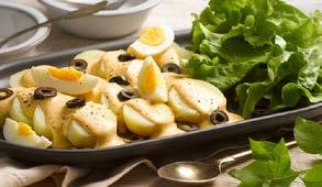 • Baña las papas con la salsa huancaína. Decora con rodajas de huevo duro y aceitunas negras.