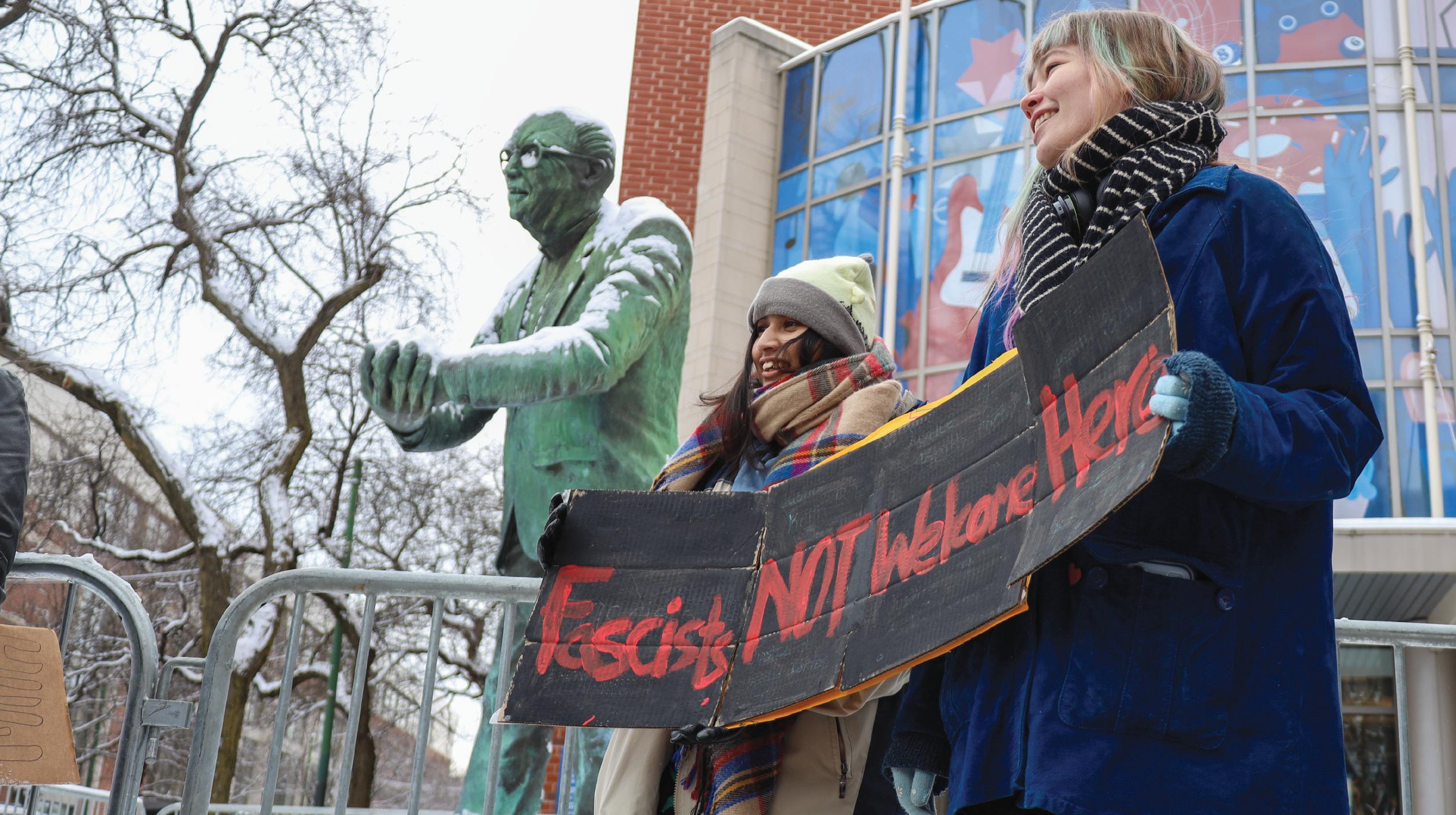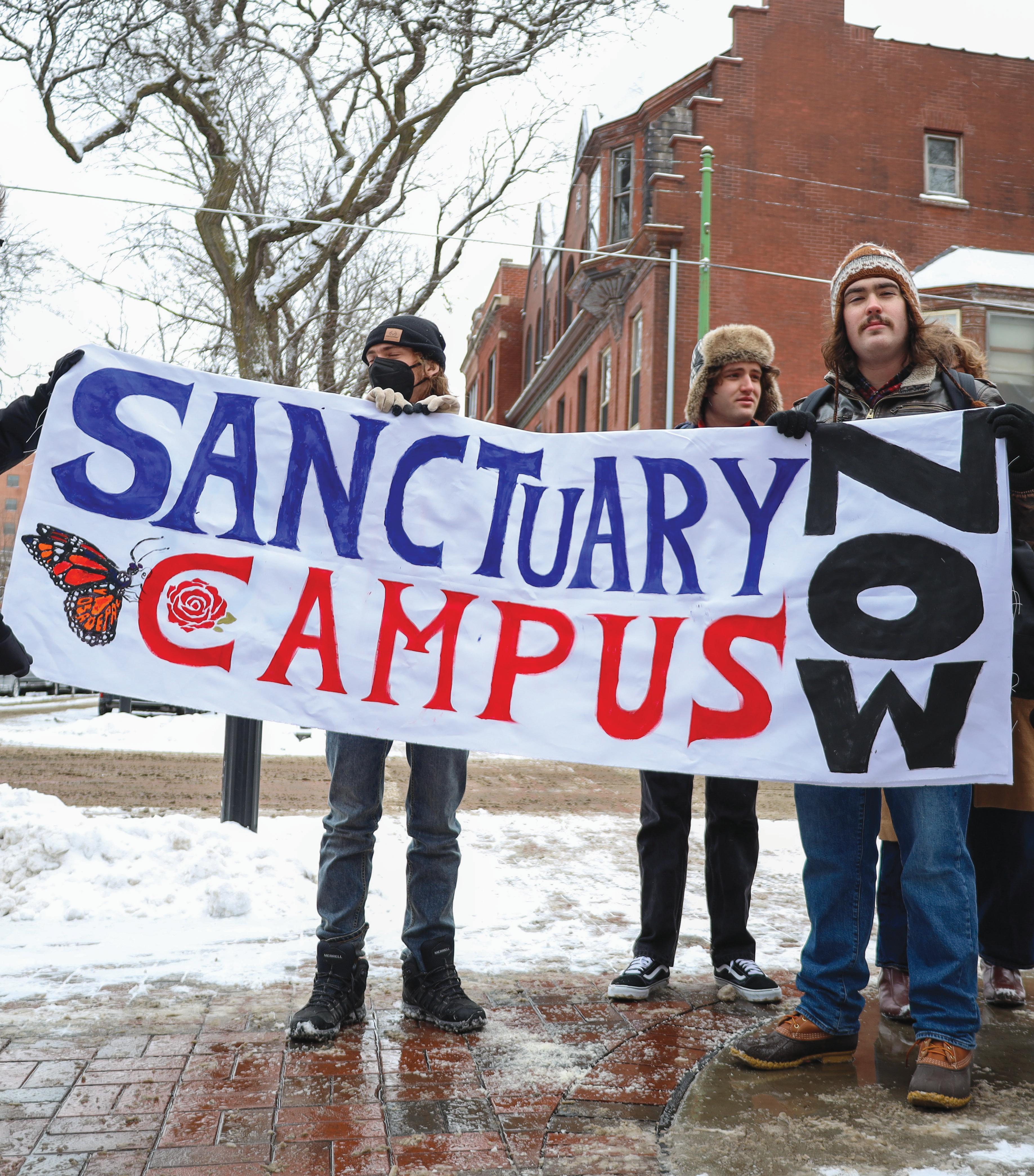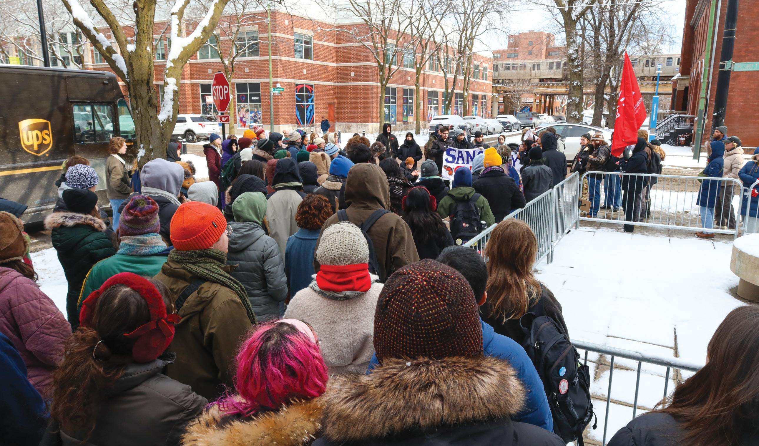 More than 150 people gathered near the Egan statue in DePaul’s Lincoln Park campus in below-freezing temperatures to urge the university to declare itself a sanctuary campus and oppose potential Immigration and Customs Enforcement raids. It was organized by the Young Democratic Socialists of America on Friday, Jan. 30, and included a petition delivery to the university administration.
