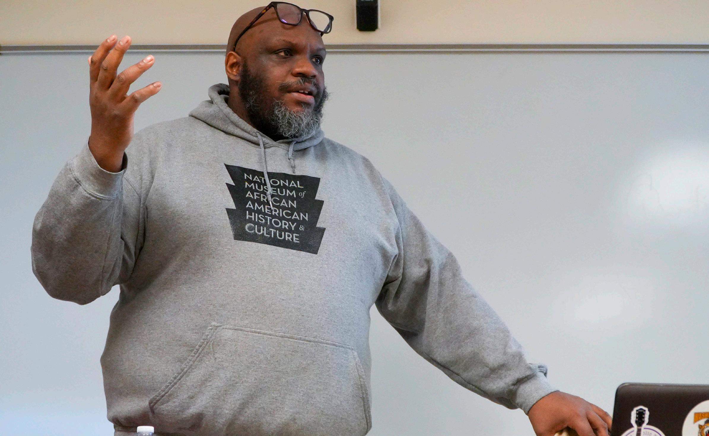Adjunct faculty member Evan Moore talks to his class on Wednesday, Feb. 11, 2026. He teaches a class at DePaul called “Sports and Culture.”
