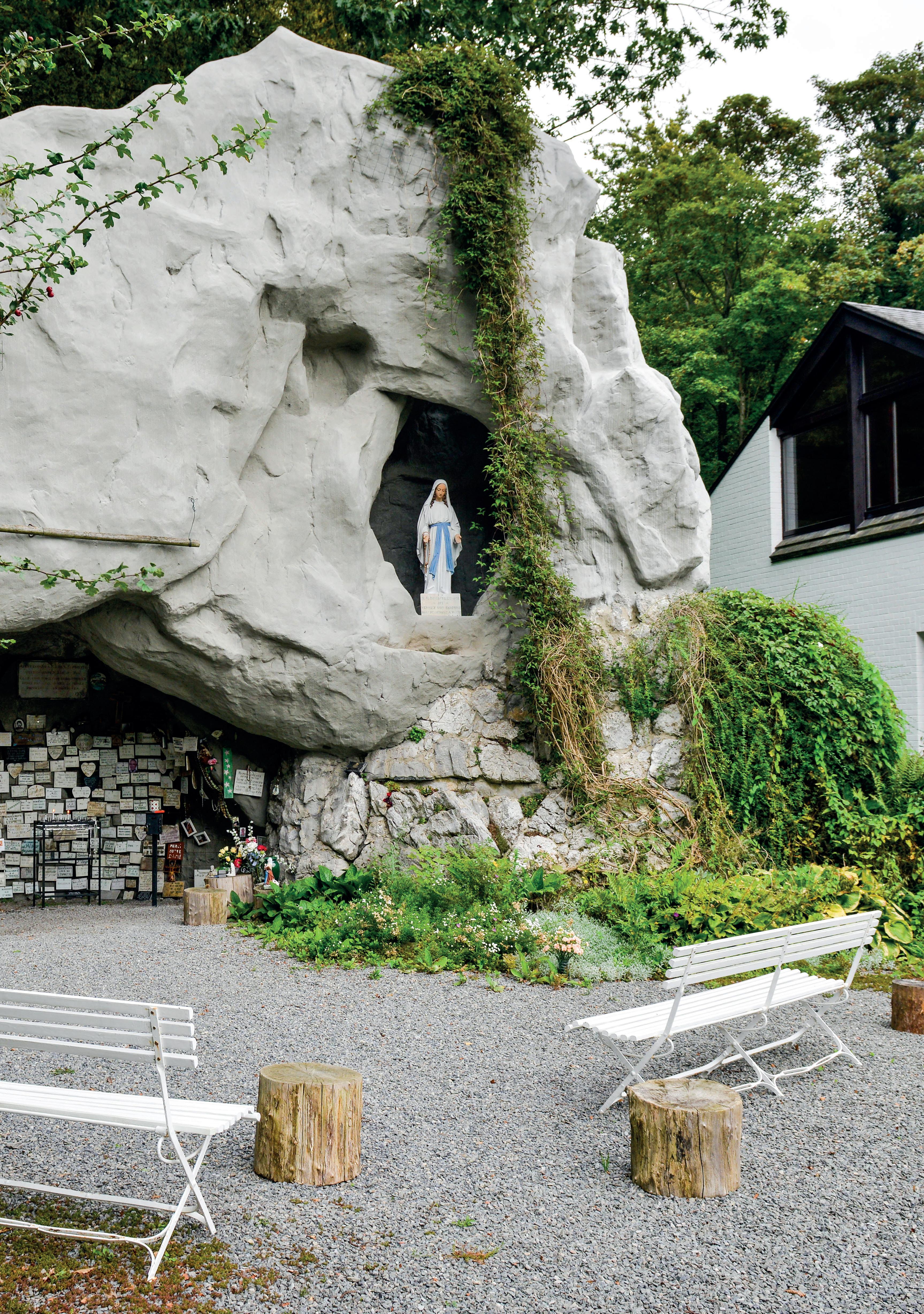 van monumentaal formaat. Dat is zeker niet gelogen. Mits enige verbeelding én overdrijving waan je je echt in Lourdes. De ontwerper, van wie de naam niet bekend zou zijn, heeft alleszins zijn best gedaan. ‘Vooraan vertoont de grot een vrij gladde rotsimitatie in kunststeen, achteraan is ze afgewerkt met breuksteen’, zo beschrijft Veerle De Houwer van het Agentschap Onroerend Erfgoed de constructie. ‘De voorzijde is grotendeels overgroeid met klimop en andere klimplanten. Rechtsboven bevindt zich de nis met een Mariabeeld. Voor de grot staat het beeld van de knielende Heilige Bernadette.’
