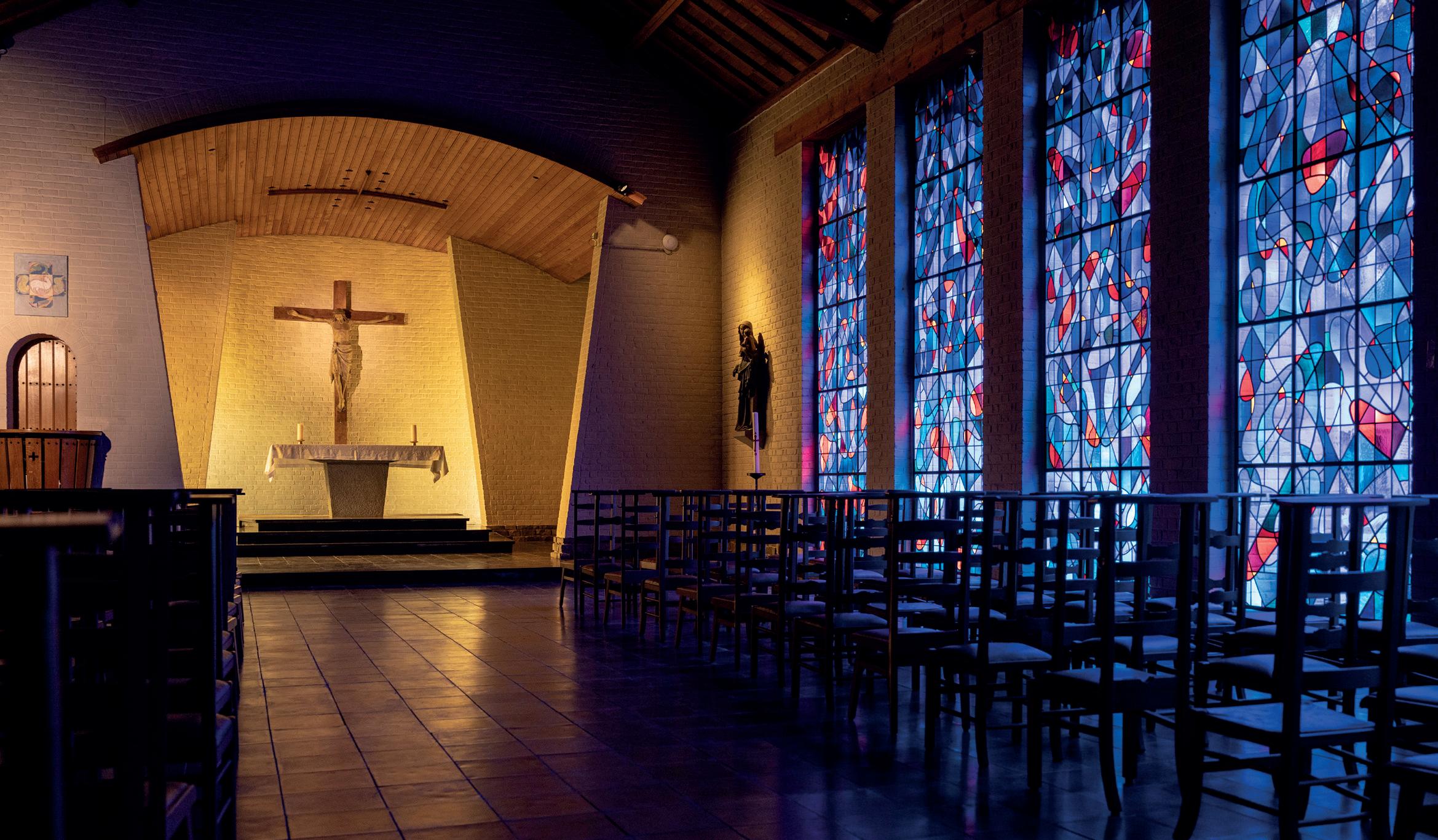 Ook de directeur van het centrum wijst op de pracht van de glasramen. ‘De glasramen zijn een verwijzing naar hoe het licht het bos binnenvalt. Dat is geen toeval, met het Zoniënwoud op een steenworp van onze site. De kapel, destijds ontworpen door een oud-leerling van Victor Horta, is bovendien bijna helemaal opgetrokken uit hout. Ook dat was een bewuste keuze’, zegt de Roissart. ‘De kapel is een ideale plek om te bidden, tot rust te komen of esthetisch te genieten. Grote ceremonies, zoals trouwfeesten, houden we hier niet. Maar iedereen is er welkom. En dus ook de mensen die we hier ontvangen in ons retraitehuis en gemeenschapscentrum. Dat zijn er ongeveer 3.500 per jaar. Daarbij onder meer kinderen die catechese volgen, leerlingen van katholieke scholen of groepen mensen die op bezinning komen, personen met een theologische vorming … Met een groep van twaalf ontvangen we de mensen hier in de best mogelijke omstandigheden.’