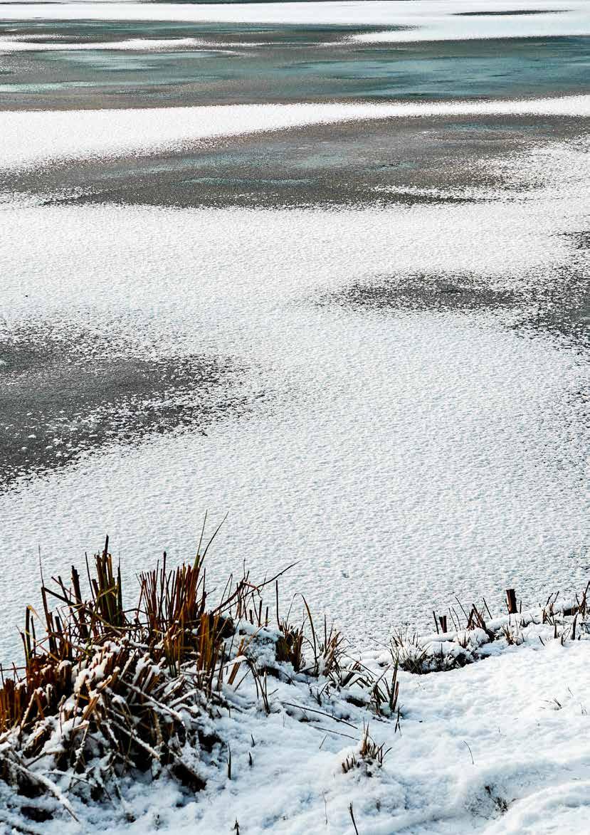 Tijdens het voorbije vriesweer bood de Jourdain-vijver een schitterend uitzicht. Omdat het niet te hard vroor, waren sommige delen van het water wel bevroren, andere niet. Vermoedelijk doordat de vijver gevoed wordt door bronnen. Op de plekken waar het warmere bronwater bovenkomt, bevriest het water niet bij streng vriesweer. Een zeldzame kans voor een foto van een intiem en abstract Kraainems sneeuwlandschap.