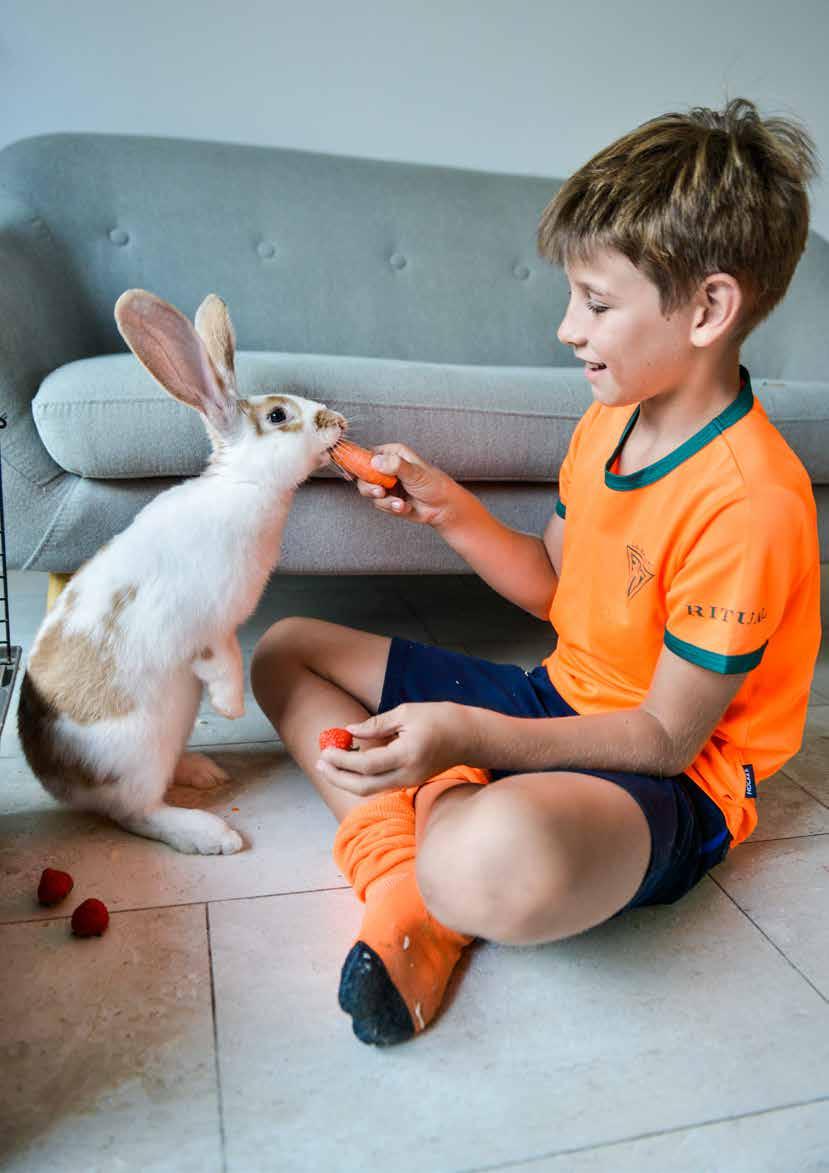 Theo, de Vlaamse reus Theo is de Vlaamse reus met vlinderoren van Tristan (10). ‘Toen hij hier aankwam, was hij een schattig, klein konijntje. Hij is nu zes maanden en wordt nog een heel stuk groter. De living is zijn terrein. Hij slipt met zijn pootjes op de gladde vloer als hij rondloopt en stampt met zijn achterpoten als hij aandacht wil of bang is. Ik geef hem hooi, granen, groenten en fruit en zoek speeltjes voor hem. Hij deelt zijn kooi met Jefke, de cavia. Het zijn goede vriendjes, enkel bij het eten, is het een strijd voor de lekkerste hapjes.’ Tekst & foto Tine De Wilde