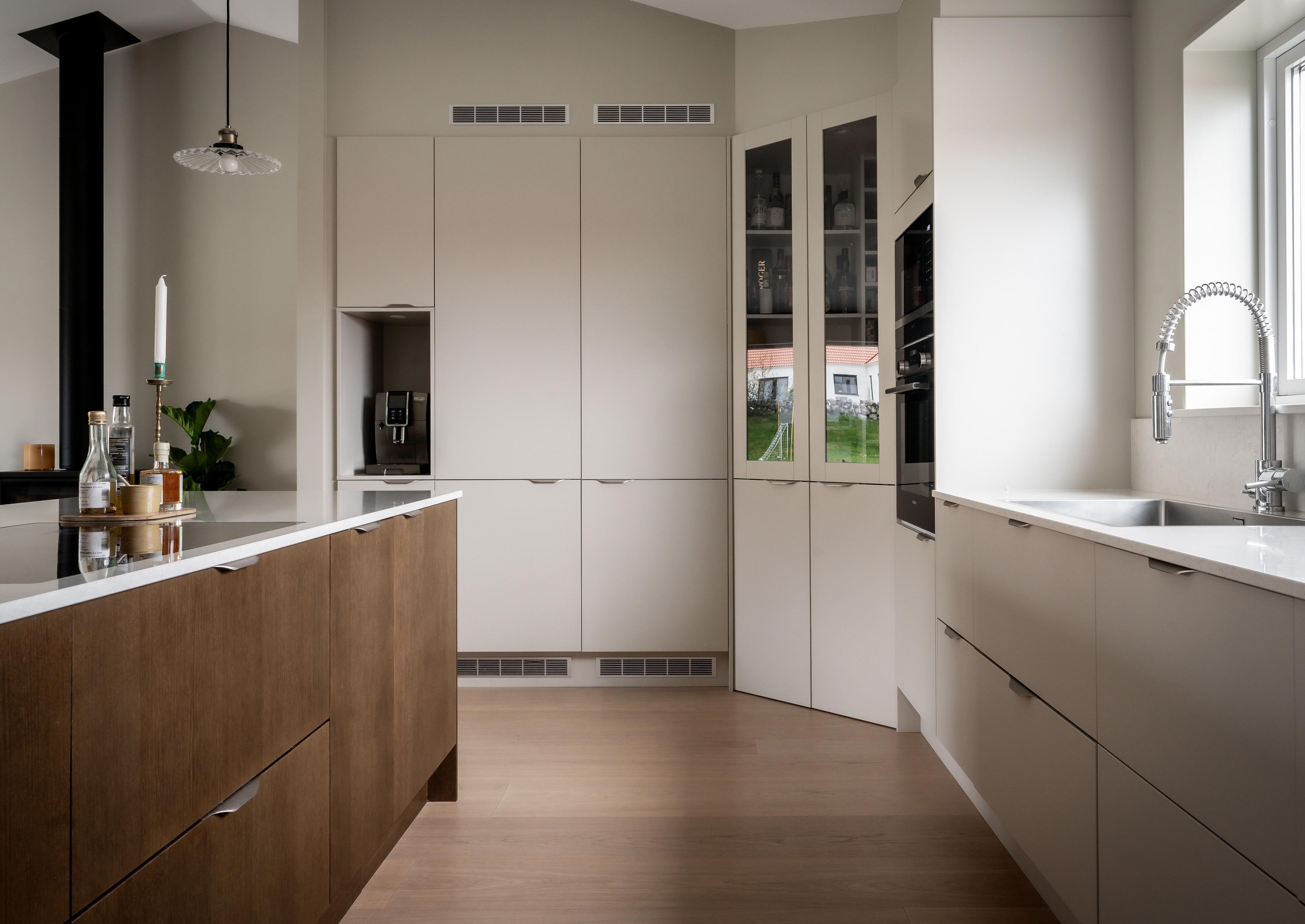 Villa Stenudden erbjuder en generös och öppen sällskapsdel med kombinerat kök, matplats och vardagsrum. Här finns gott om plats att umgås och att arbeta flera samtidigt i den stora köksdelen med en köksö.