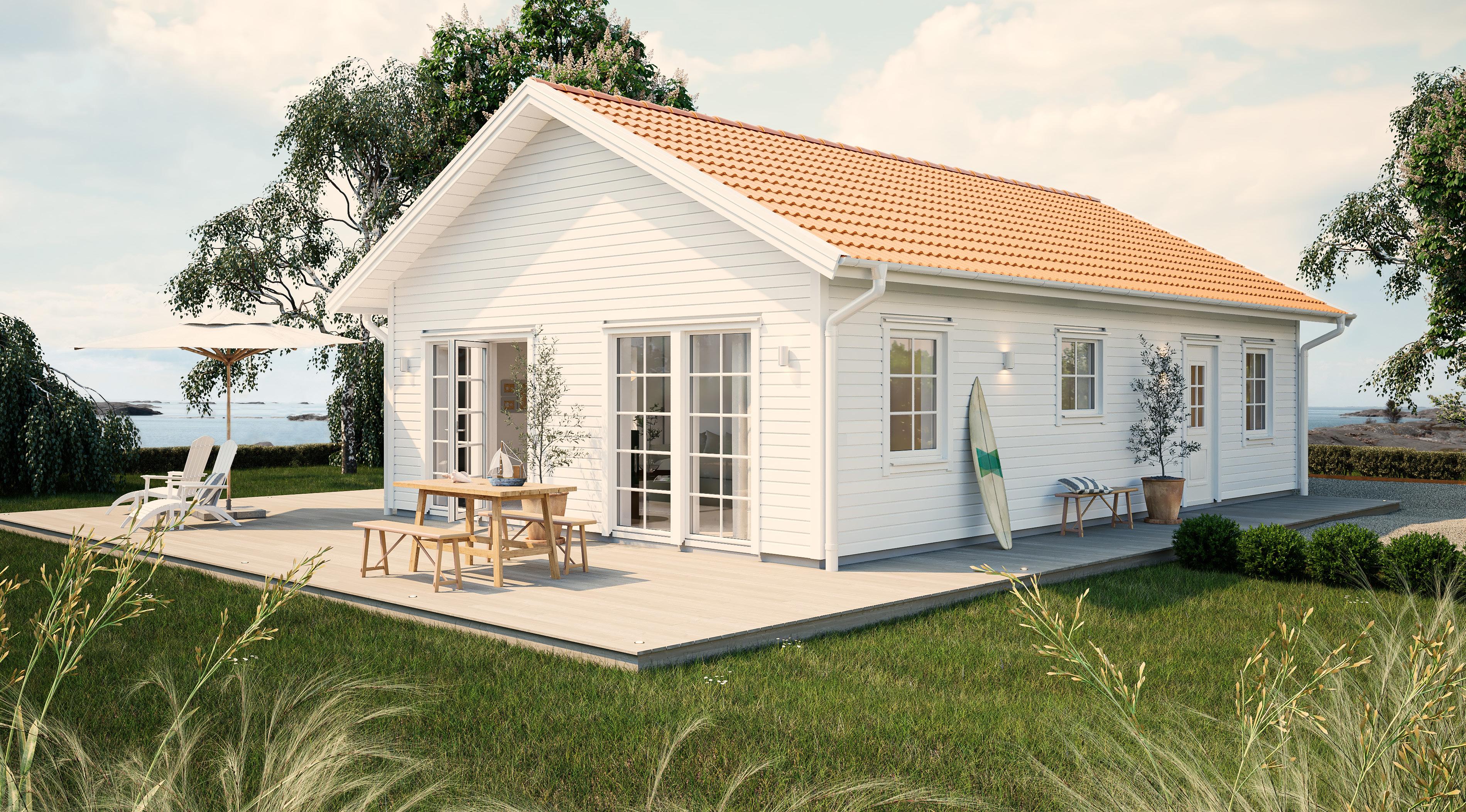 Enkelt i formen men fullt utrustat med ett rejält kök och tre sovrum gör Mölle till det idealiska fritidshuset. Med en byggarea under 90 m2 passar huset in i många detaljplaner i fritidshusområden. För dig som önskar ett mindre fritidshus har vi tagit fram en variant med två sovrum där byggarean är 80 m2. Denna variant kan du enkelt utrusta med en bastu för extra lyx.