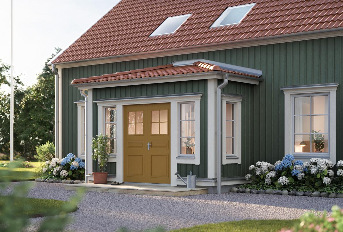 Torekov modern har sin uteplats delvis under tak då pulpettak och väggar fortsätter utmed husets fasad. Denna husmodell finns i två utföranden och tre olika planlösningar.