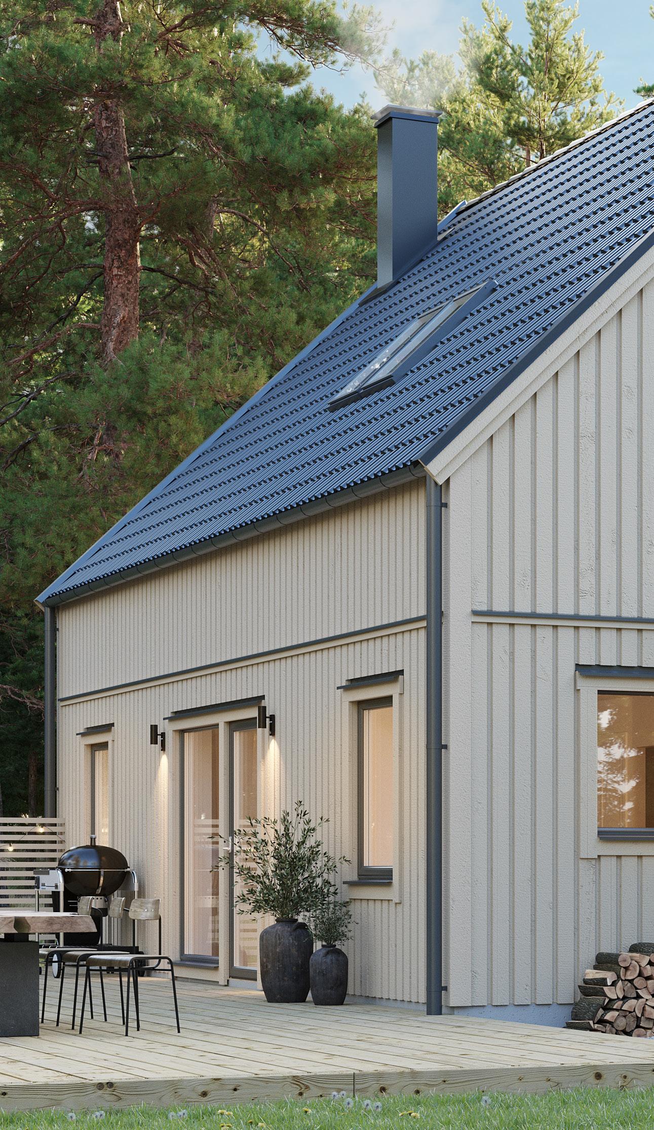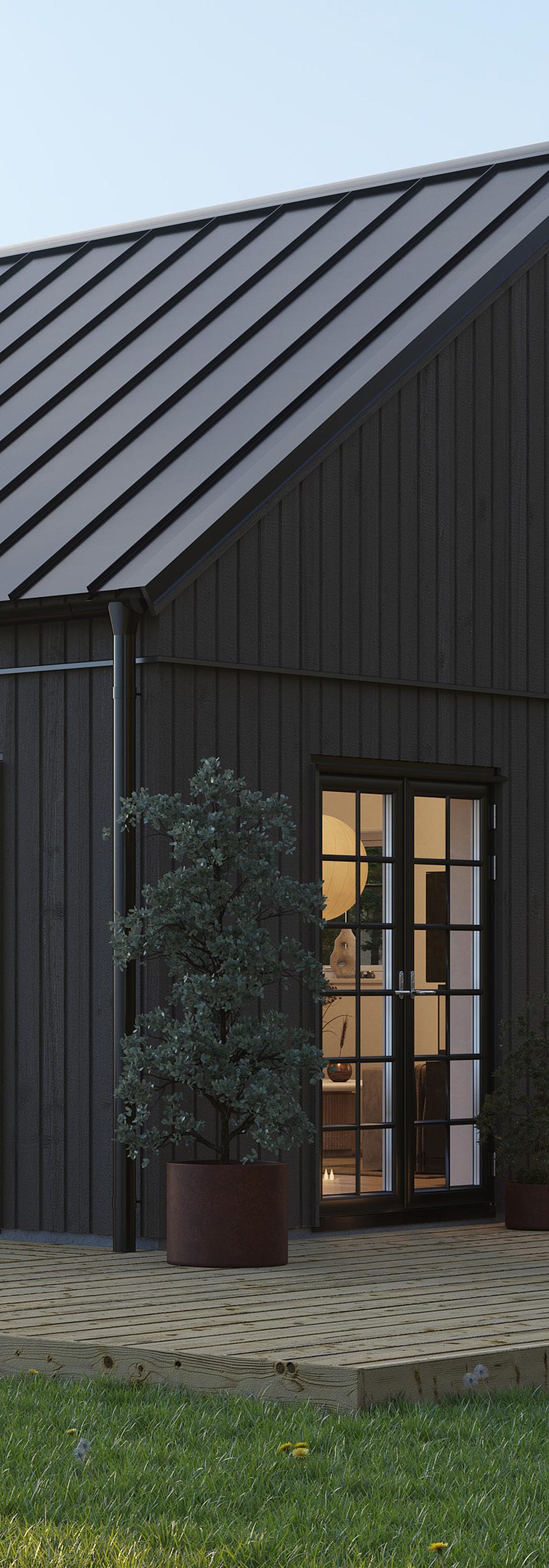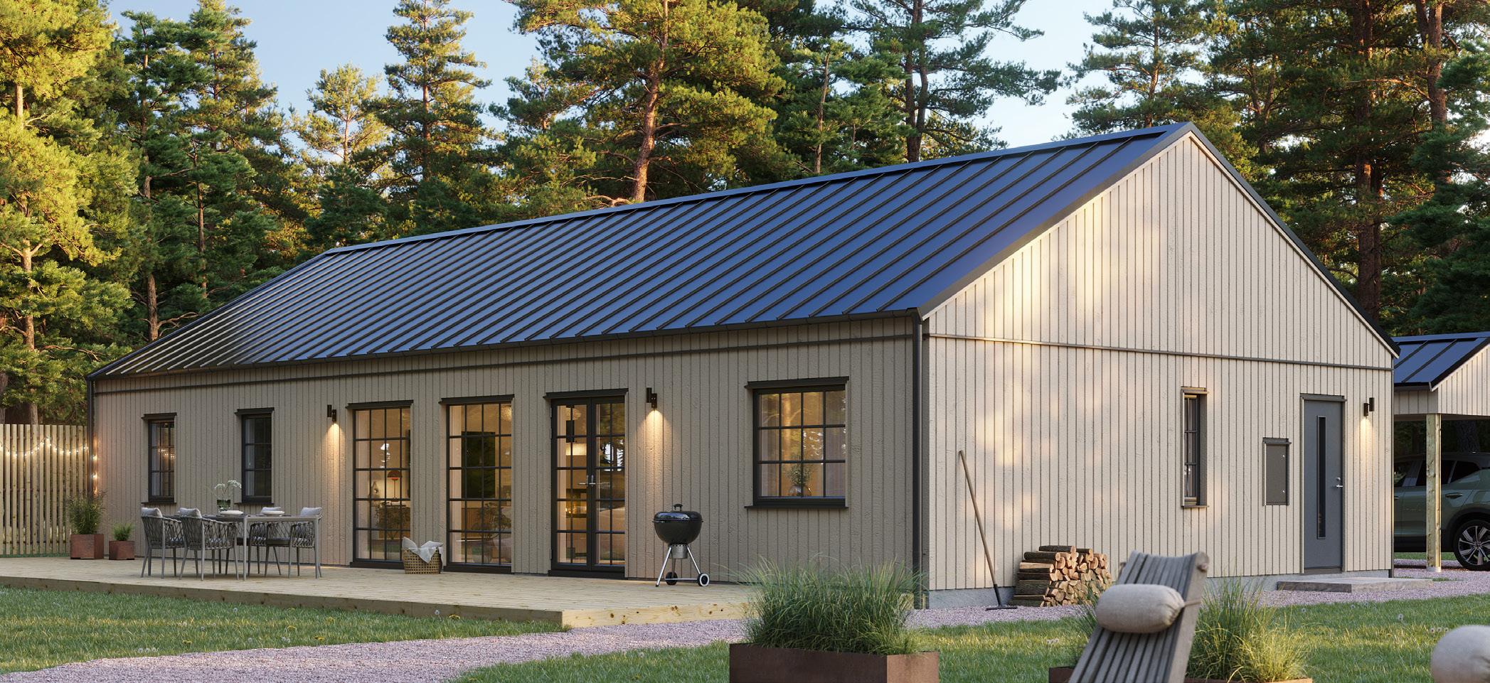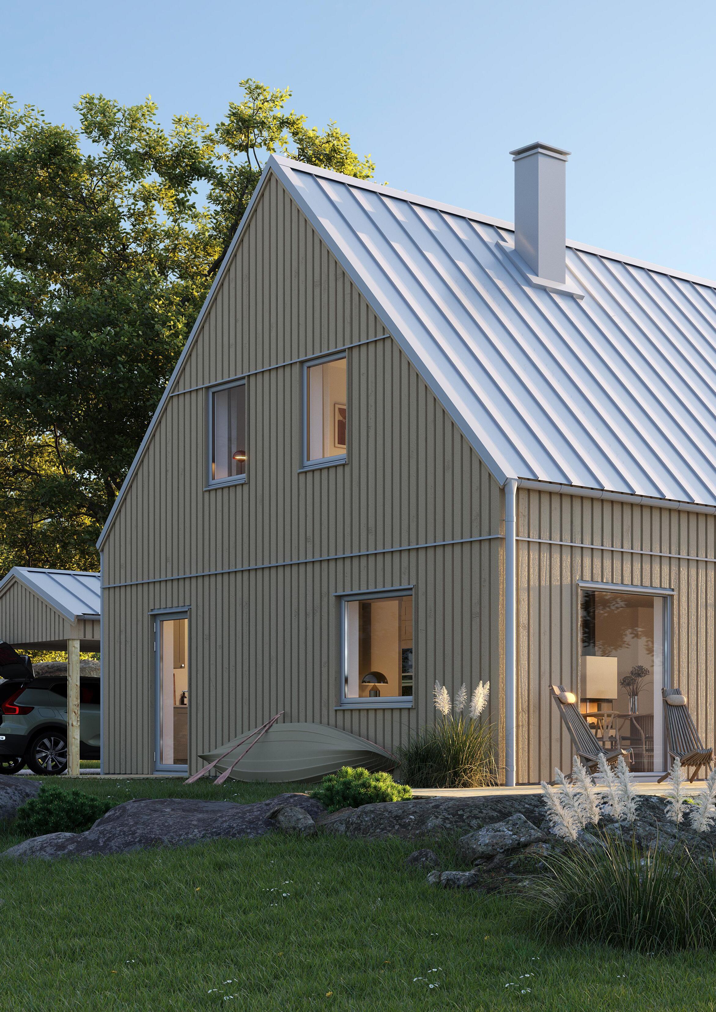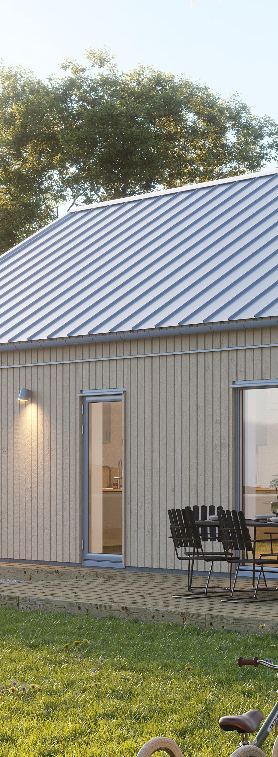 Du väljer fritt bland förutbestämda val såsom stående eller liggande panel, lång eller minimal takfot, färg på takpanna, ytterdörrar eller variant av laminatbänkskiva.