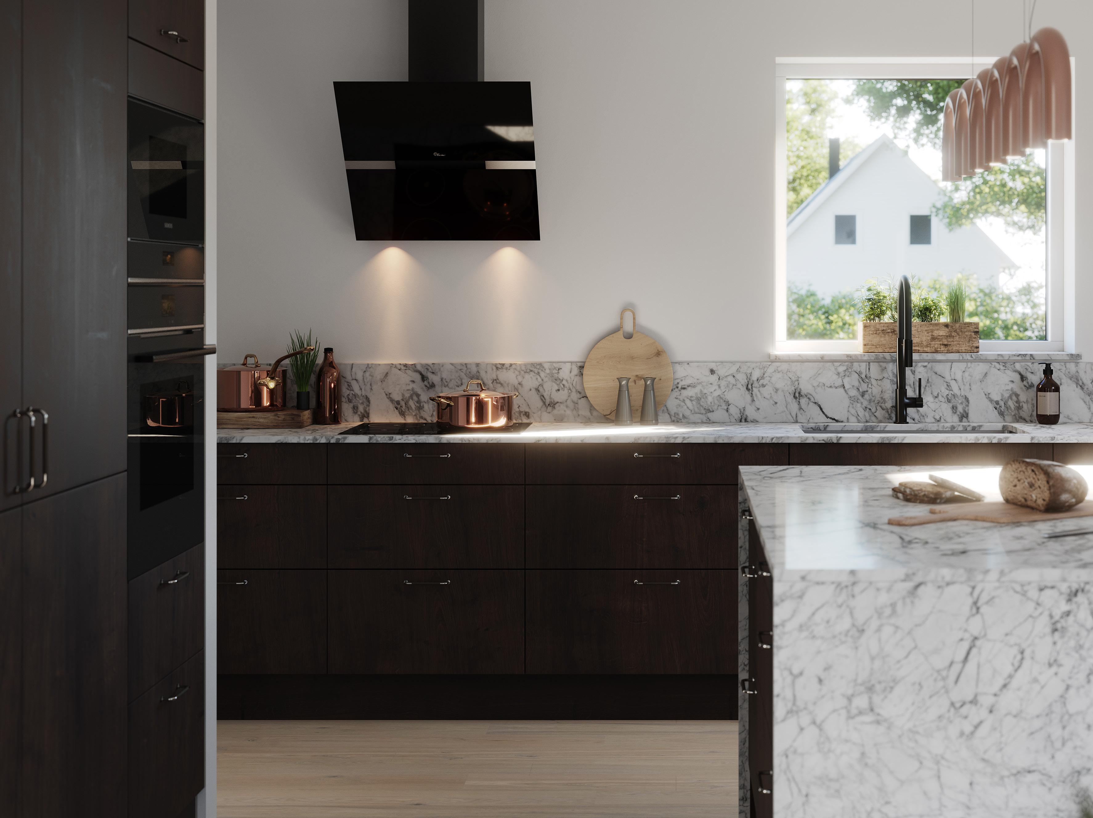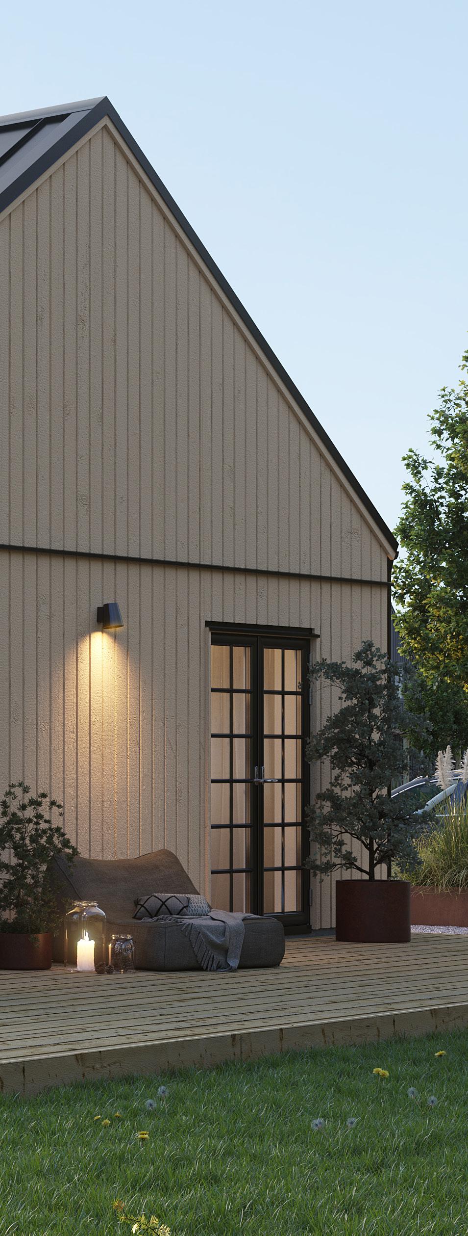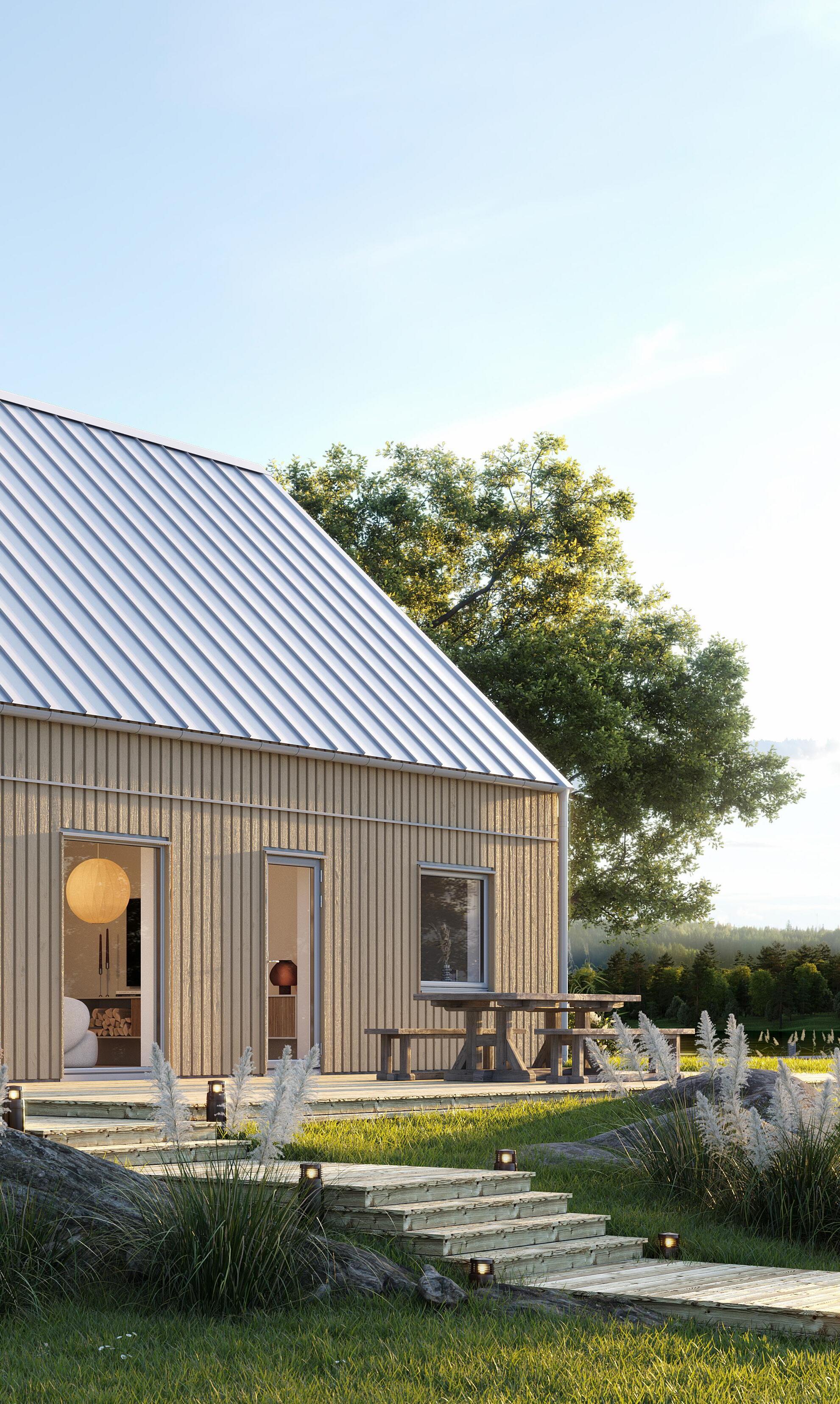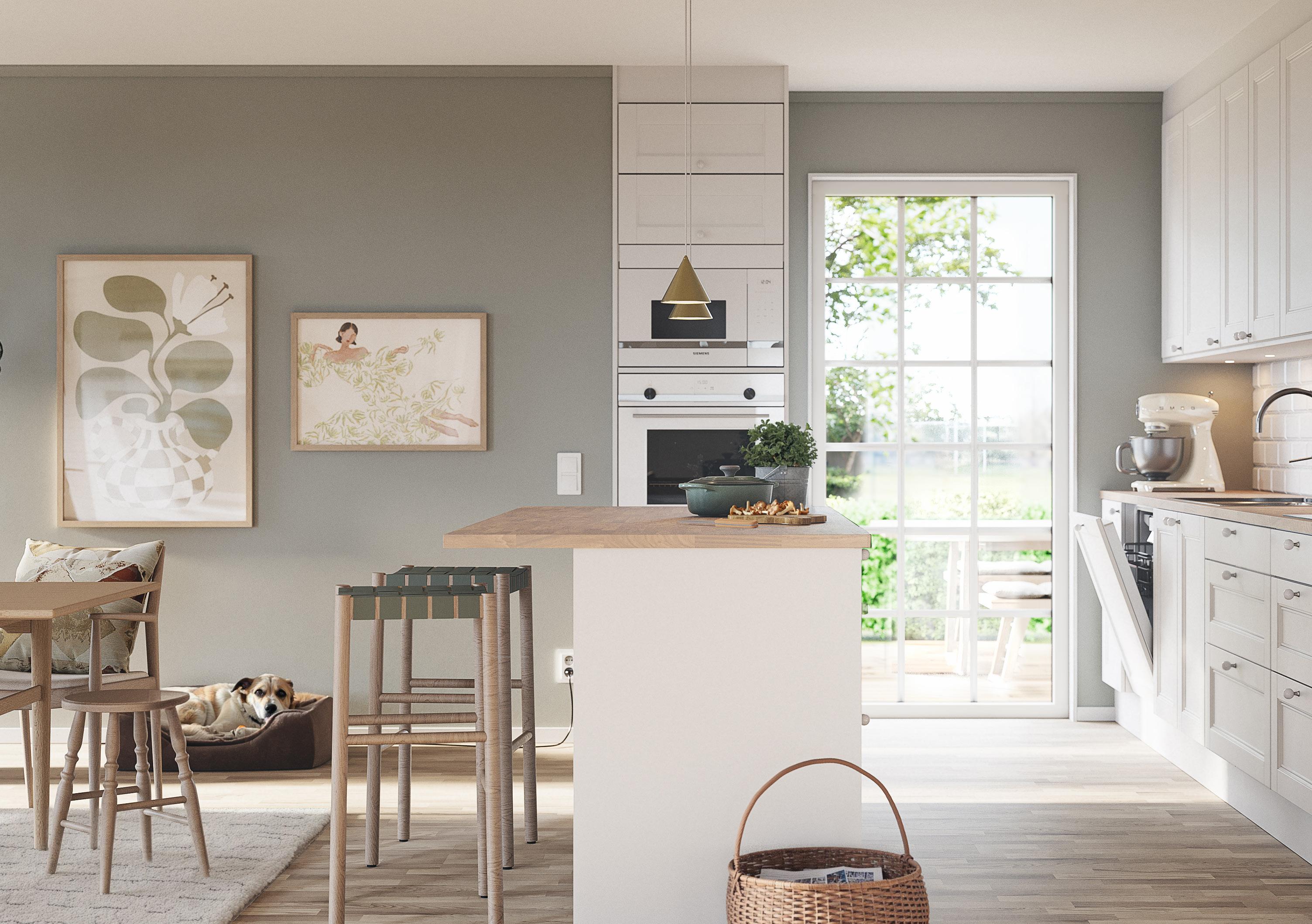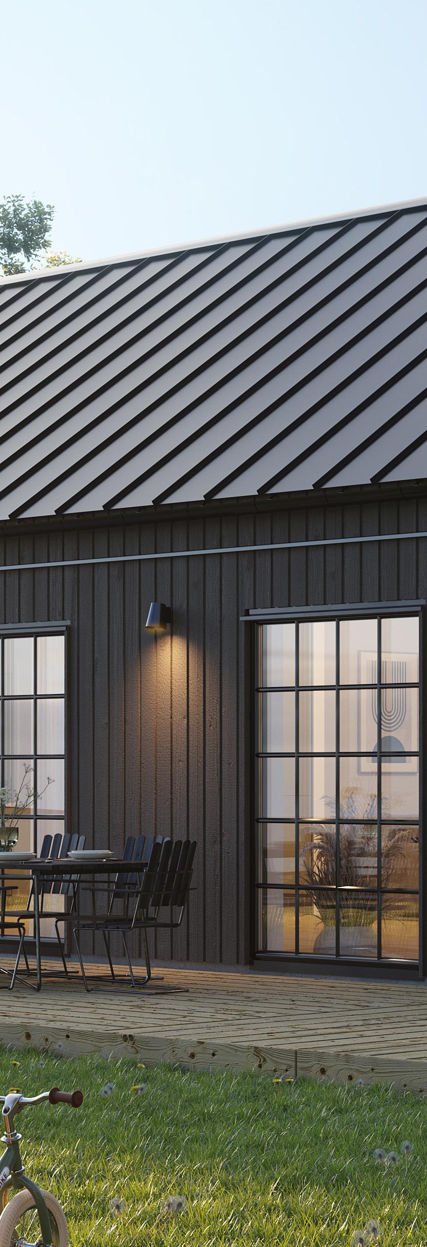 Du väljer fritt bland förutbestämda val såsom stående eller liggande panel, lång eller minimal takfot, färg på takpanna, ytterdörrar eller variant av laminatbänkskiva.