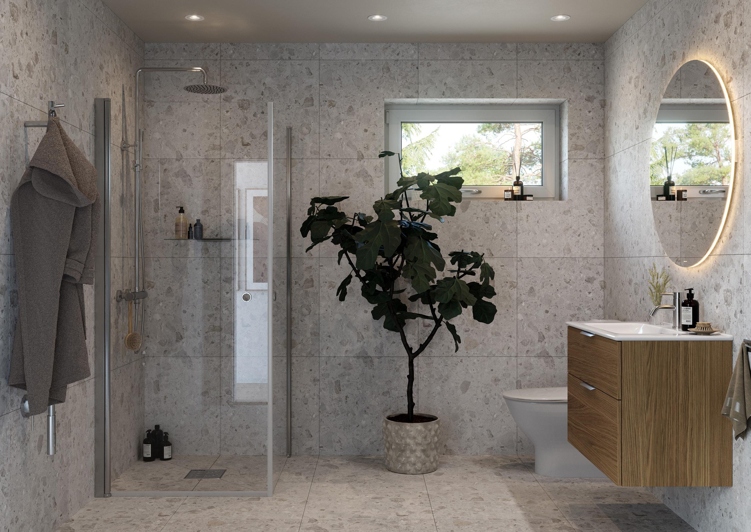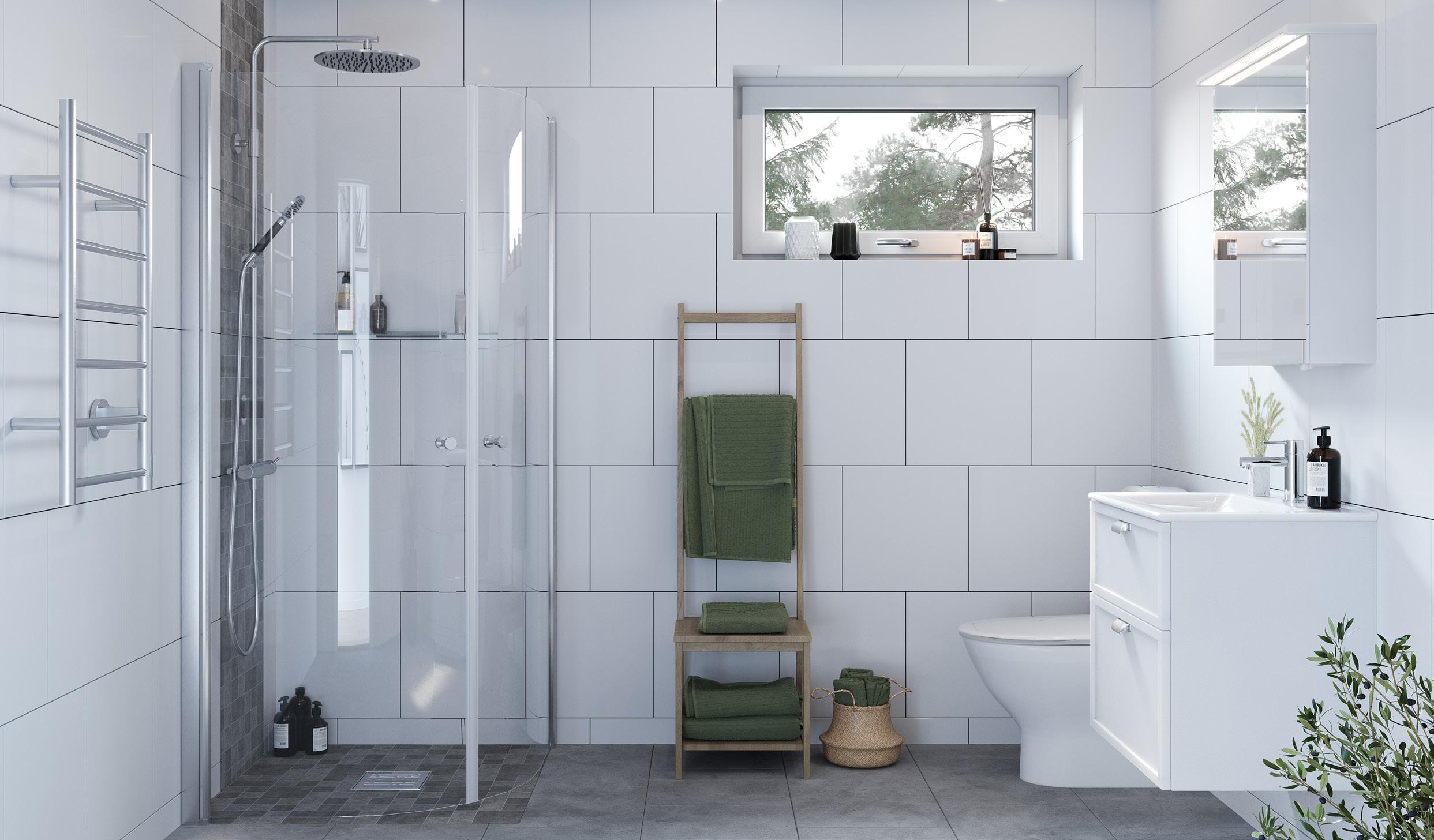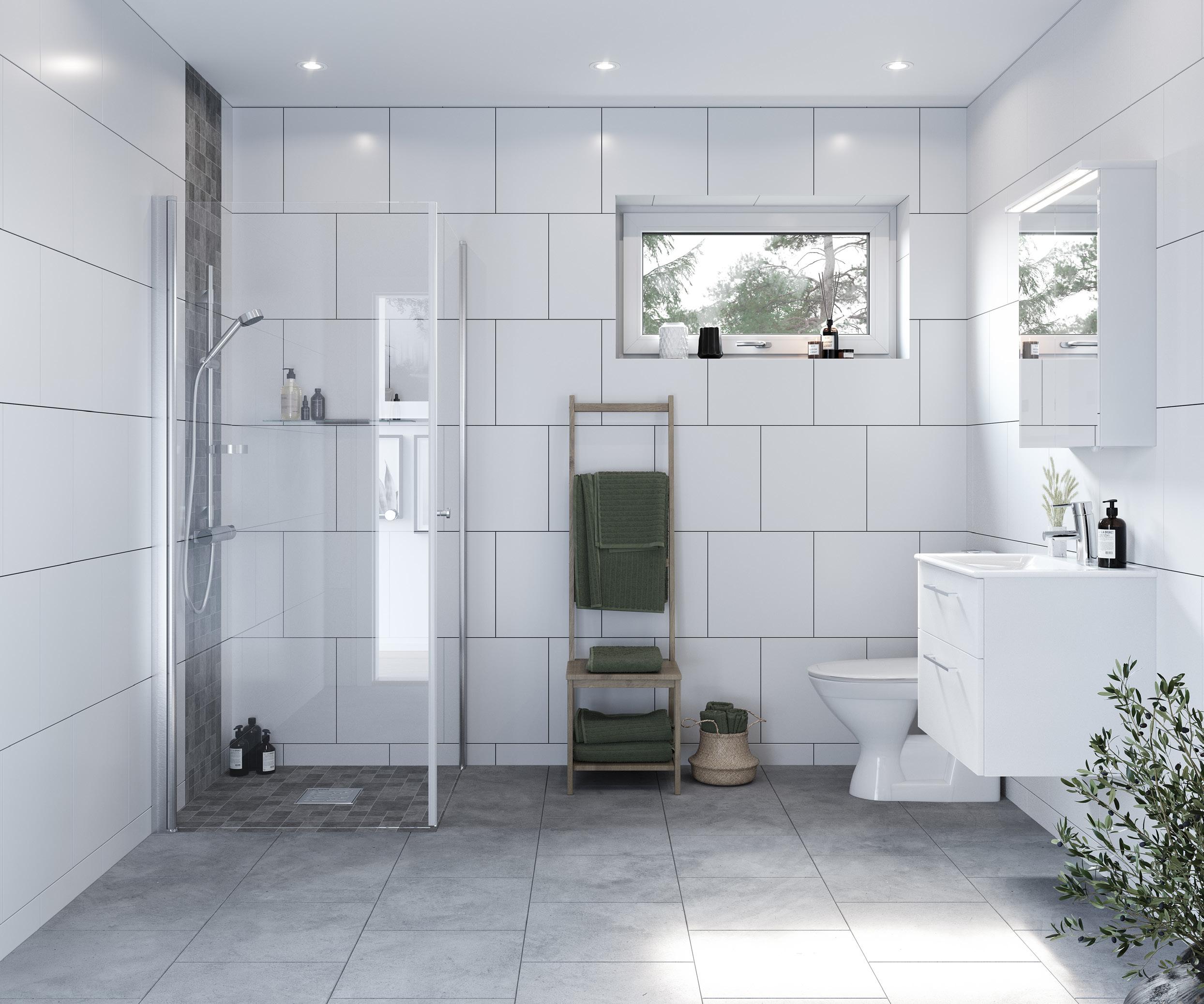 Helkaklat wc/dusch och badrum i alla våra hus är ett exempel på generös grundstandard. Annat exempel är att alla våra hus levereras med golvvärme i plattan, massiva innerdörrar och för de hus som har trappa är vitlaserad furu en självklar grundstandard för oss.