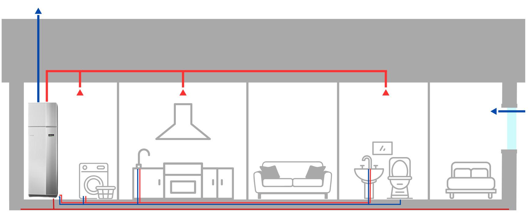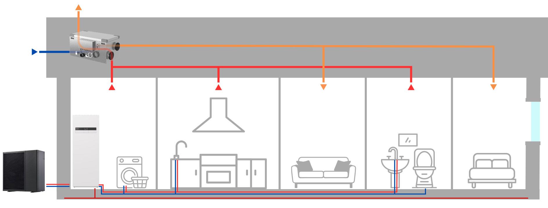 En annan klok installation som bidrar till låg energiförbrukning är vår frånluftsvärmepump från Nibe. Denna frånluftsvärmepump ingår i alla våra hus och sparar energi i två omgångar: dels återvinner den värmen från luften som släpps ut genom ventilationen och dels är själva värmepumpen energisnål. För dig som vill erbjuder vi också ett kombinerat värme- och ventilationssystem.