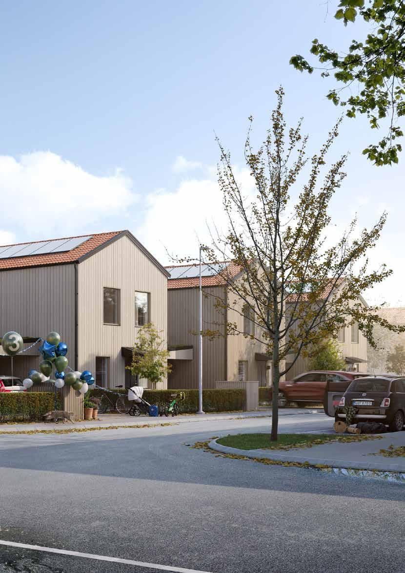Utemiljön bidrar med bekvämligheter såsom förråd, avfallshantering och carport på den egna uppfarten. Baksidan av huset når man genom passage via carport och altan. Här erbjuds en god tilltagen yta som ger möjlighet att skapa en personlig trädgård - en plats för avkoppling, lek eller odling? Tomterna planeras med trall, och ramas in med plank eller häck.