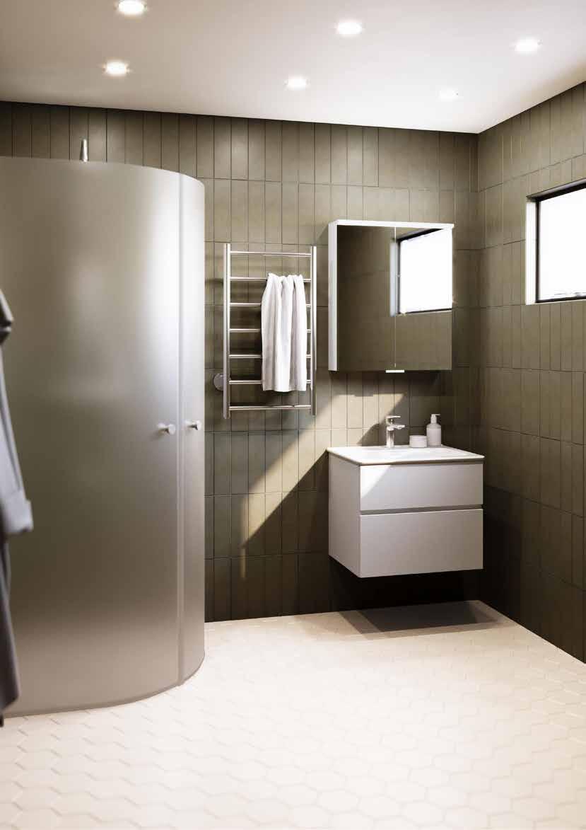 Badrum/tvätt: Vit kommod med handfat och spegelskåp från Svedbergs. Golvstående toalett från Ifö och raka duschväggar med klarglas från Svedbergs. Dusch och tvättställsblandare från Mora. Kakel på väggar och klinker på golv. Tillval för badkar kan göras på entréplan. Handdukstork ingår på övre plan. Tillval på komfortgolvvärme kan göras på övre plan.