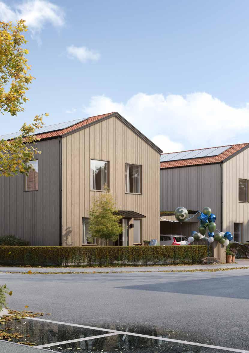 Husen byggs i trä, har två olika naturnära kulörer och modernt uttryck med minimal takfot. På taket sitter solceller som fångar solens strålar, och omvandlar dem till lägre elkostnader och hållbar energiförsörjning. Skönt för både plånboken och magkänslan.