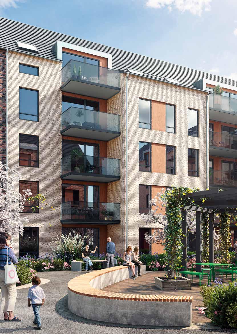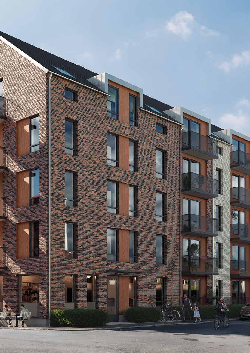 I tegelhus om fyra till fem våningar samsas hyresrätter och bostadsrätter kring en grön privat innergård med sköna mötesplatser. Här finns möjligheter till grillkvällar eller varför inte en kaffe med grannen i vårsolen?