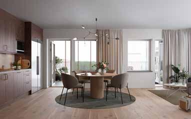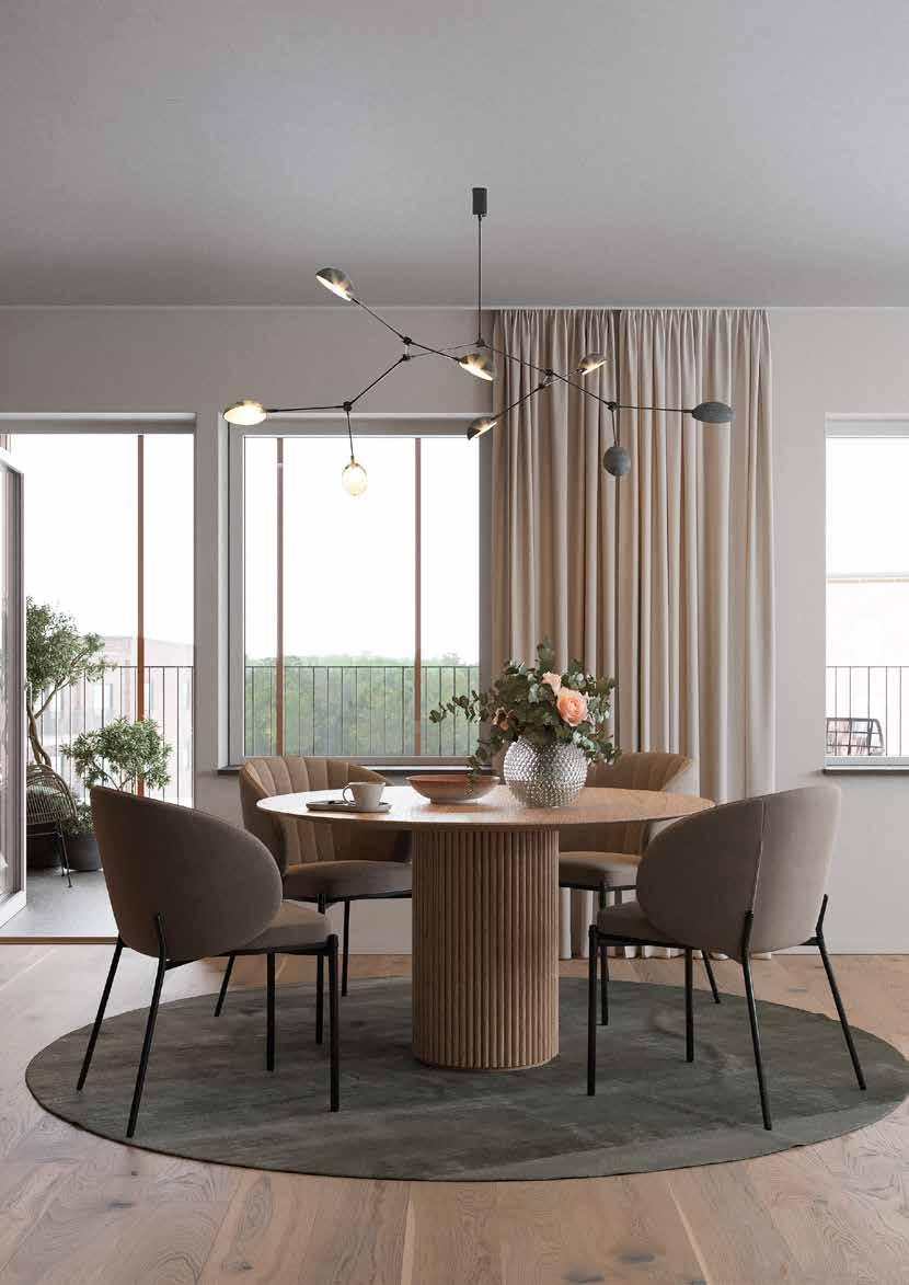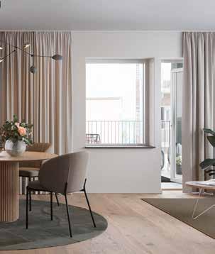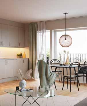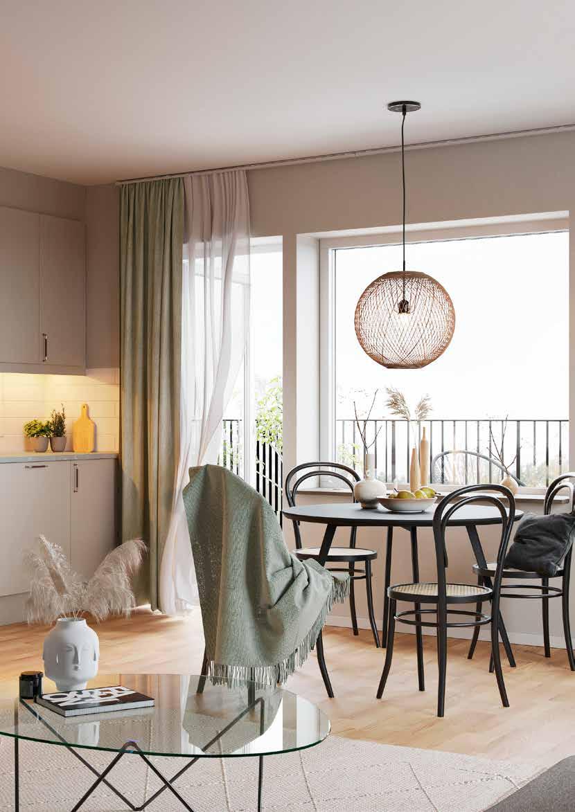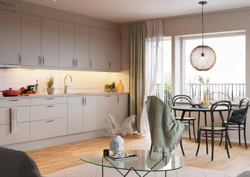Lägenheterna har en rymlig entré med ett slittåligt hallgolv i klinker. I anslutning ligger sovrum och helkaklat badrum med tvättmaskin och torktumlare. Vidare in i lägenheten möts du av en öppen planlösning mellan kök och vardagsrum som skapar rymd och plats för gemenskap. Alla lägenheter har fönster i minst två väderstreck som ger ett härligt ljusinsläpp. Från vardagsrummet tar du dig ut till balkongen eller terrassen med ett bra solläge. De större lägenheterna har både en öppen och en inglasad terrass eller balkong som blir en härlig plats för en kopp te.
