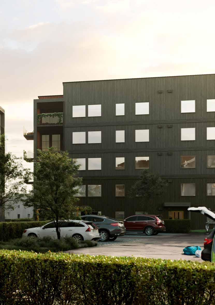 Ytan mellan huskropparna skapar en innegårdsliknande känsla som nyttjas till gemensamhetsytor och parkering. Den smyckas av olika planteringar, gräsytor och träd, samtidigt som det planeras för två gemensamma mötesplatser med pergola och grillmöjligheter. Parkeringsplatser och cykelställ ligger på bekvämt avstånd från husets entréer. Förråd och gemensamhetsförråd finns i intilliggande komplementbyggnader. Huskropparna är ett fyravånings respektive femvåningshus som är helt byggda i trä. Fasaden kläs med stående rakkantad träpanel med utsmyckade midjor i liggande panel och ett avslut mot tak i fjällpanelssättning. Hela huset målas in i två sobra gröna kulörer medan balkongerna kläs med en infärgad panel i ma