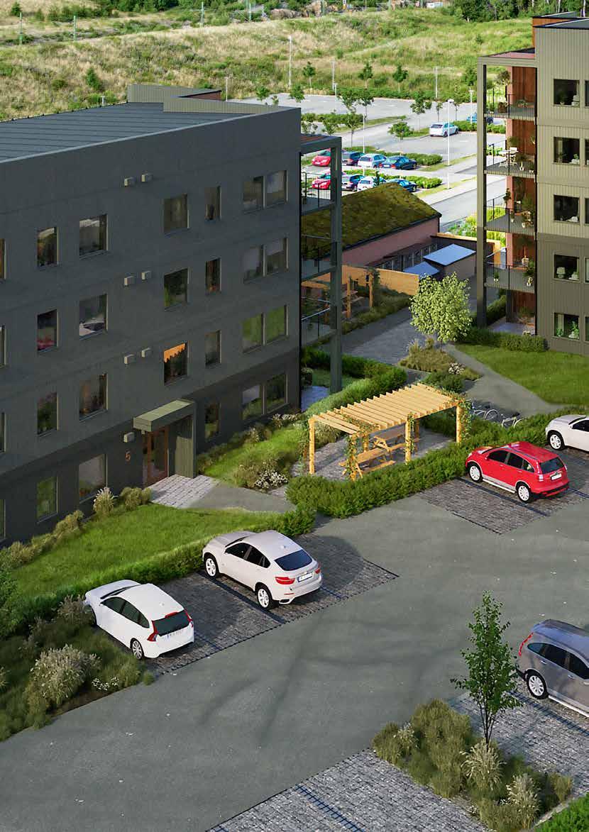Lägenheterna i den första etappen ligger i hus 1. På innergården finns två gemensamma mötesplatser med utemöbler, pergola, växter och grill. Runt husen finns flera anvisade cykelparkeringar.