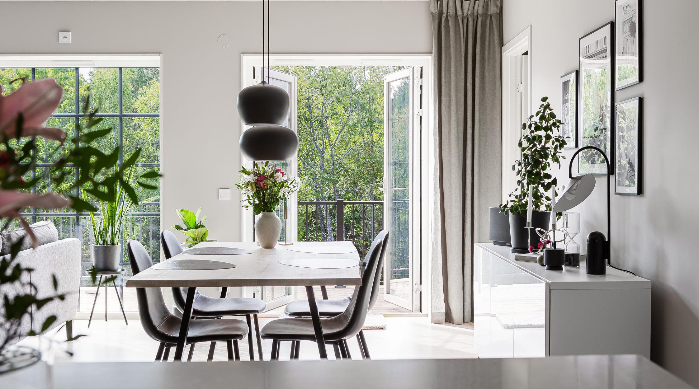 Vi kliver in i hallen och blir ståendes en stund. Wow! “Här känns det som att man svävar” säger vi, tagna av de stora vardagsrumsfönstren som bjuder på en otrolig utsikt mot svajande talltoppar.