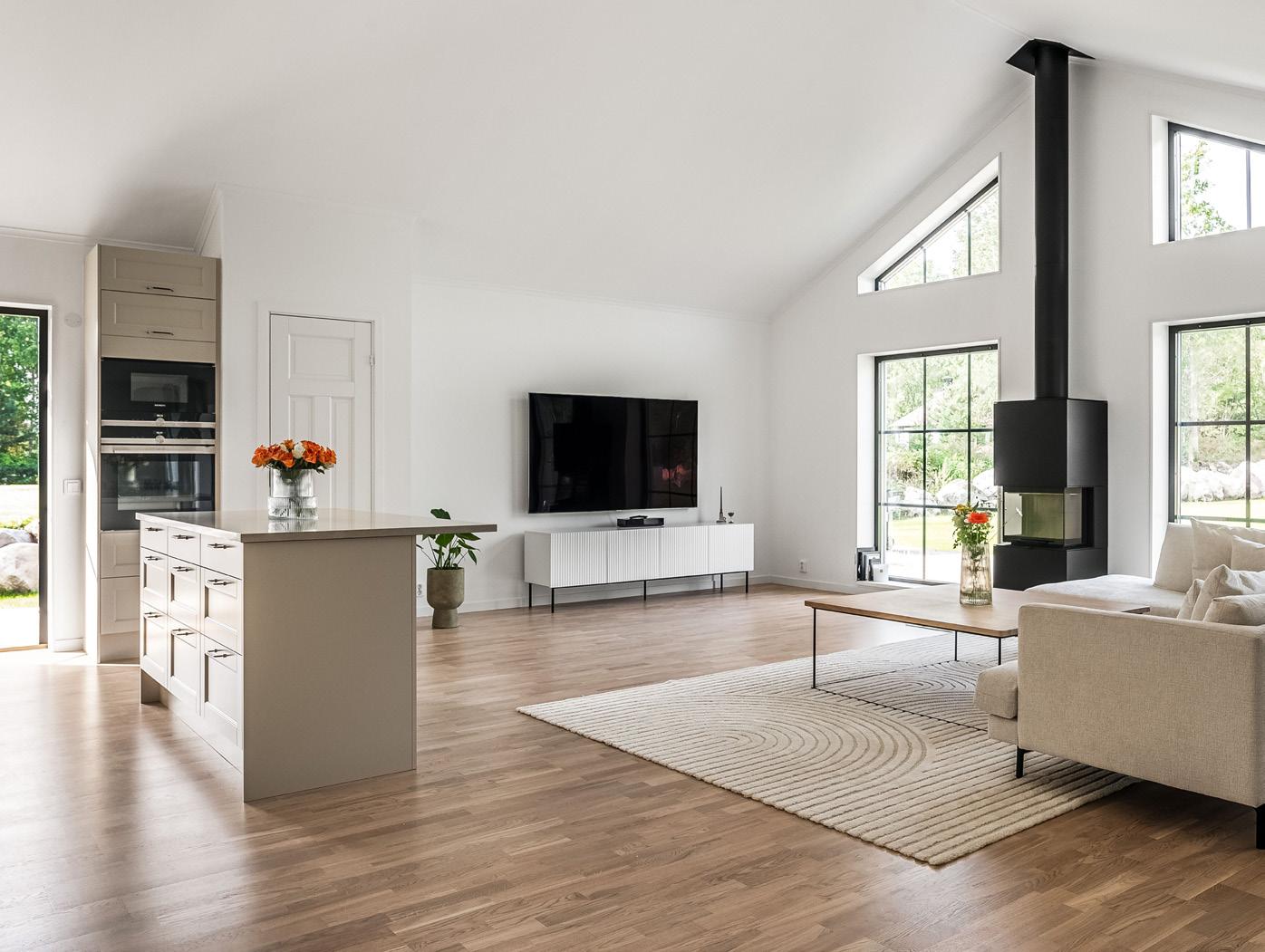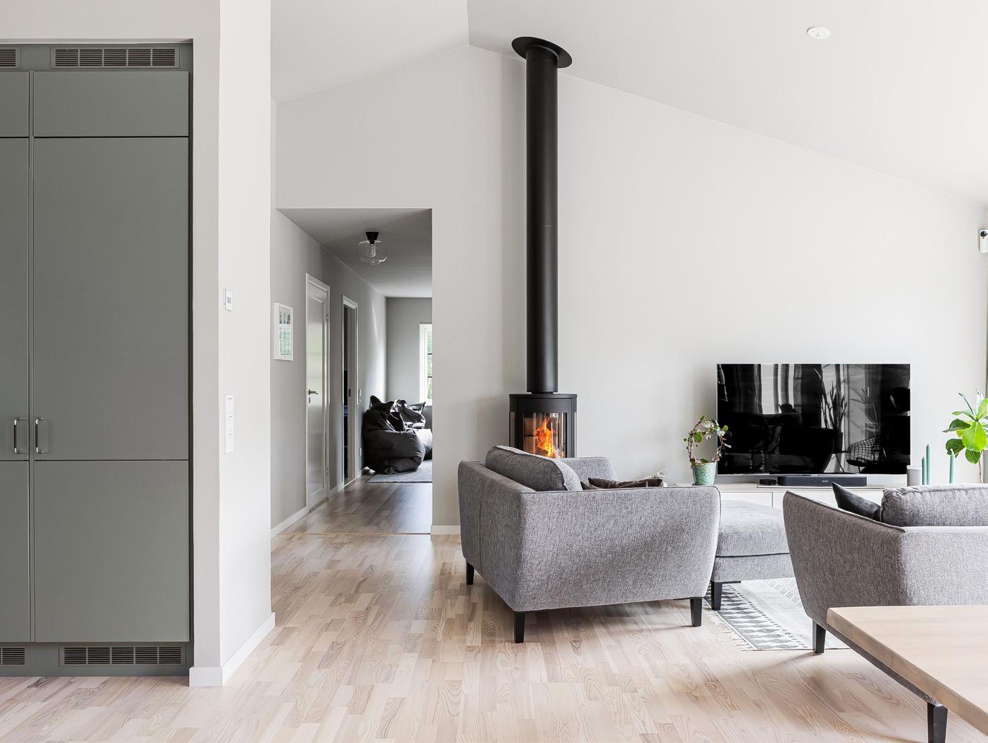 Vi förstår att den stora sociala ytan med kök och vardagsrum är familjens favoritrum. Med över 5 meter i nockhöjd, braskamin och stora fönster ut mot trädgården är det svårt att inte älska det rummet.