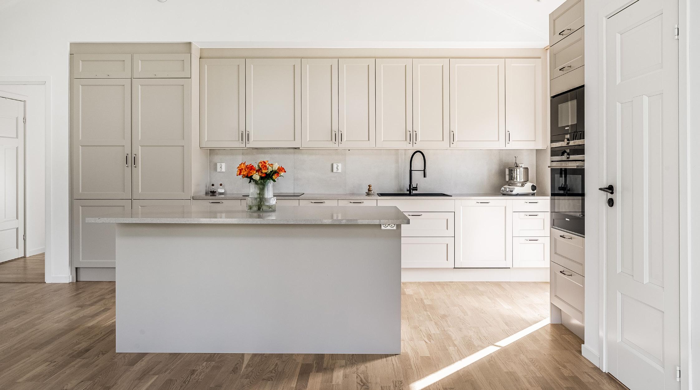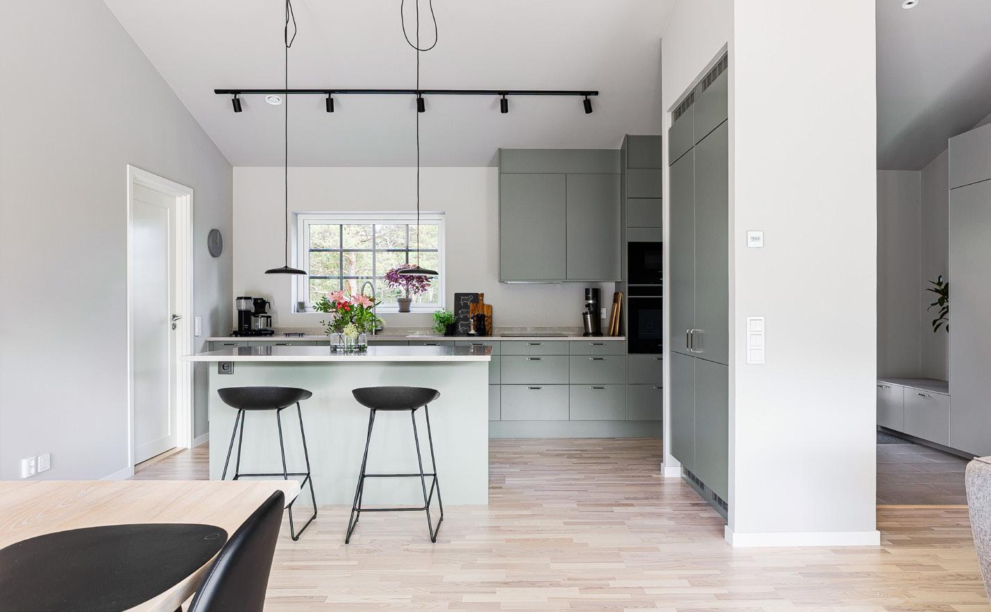 - Nej jag har gjort det själv. Här i köket har vi valt färgen “tall” på luckorna, en färg som går väl ihop med övrig inredning.
