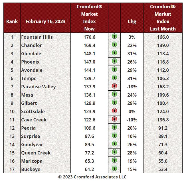 Fountain Hills held off the strong challenge by Chandler and remains in first place, for now. The rest of the Northeast Valley is clearly deteriorating for sellers, especially Paradise Valley where supply is rising and demand falling. The rest of the Central Arizona market continued to improve for sellers over the last month. Top areas include Tempe, Glendale, Avondale, Gilbert, Queen Creek, Goodyear, Phoenix and Mesa, all locations where the CMI increased by 24% or more.