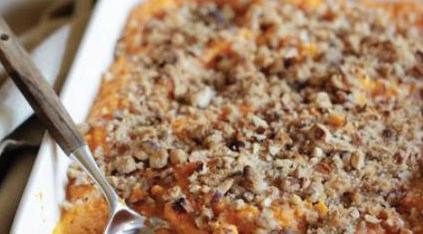 Combine nuts, brown sugar and flour in medium bowl; stir in 1 tablespoon butter. Sprinkle over top of casserole.