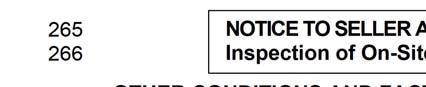 302. Responsabilidad del Vendedor respecto a las inspecciones y recorridos de inspección: El Vendedor pondrá al Inmueble a disposición para toda 303. Inspección y recorrido bajo previo aviso razonable por parte del Comprador. El Vendedor mantendrá encendidos los servicios a sus expensas, incluyendo 304. Propano hasta el COE para permitir que el Comprador conduzca estas inspecciones y recorridos.