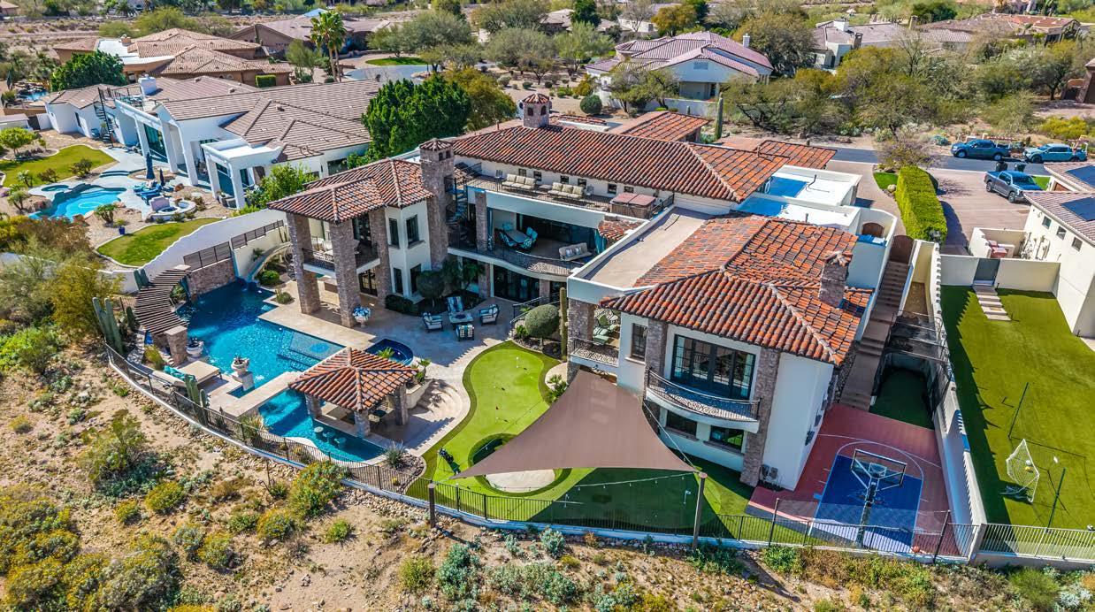 The backyard unfolds as a private desert retreat, centered around a dramatic pool and spa with fire features, cascading water elements, and ambient lighting that transforms the space at dusk. Multiple gathering areas—including a swim-up bar, shaded ramada with in-water seating, and expansive lounge terraces create an ideal setting.