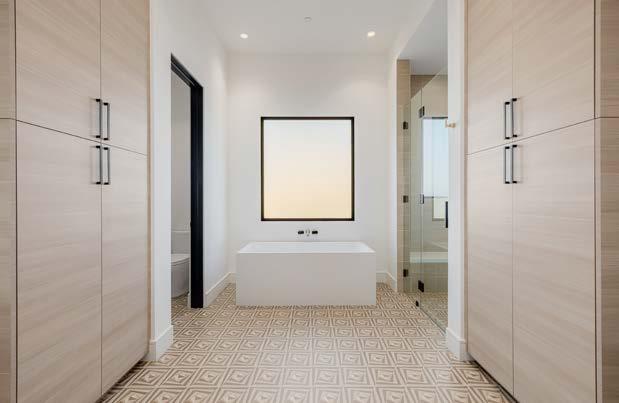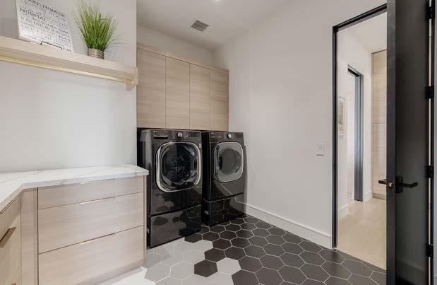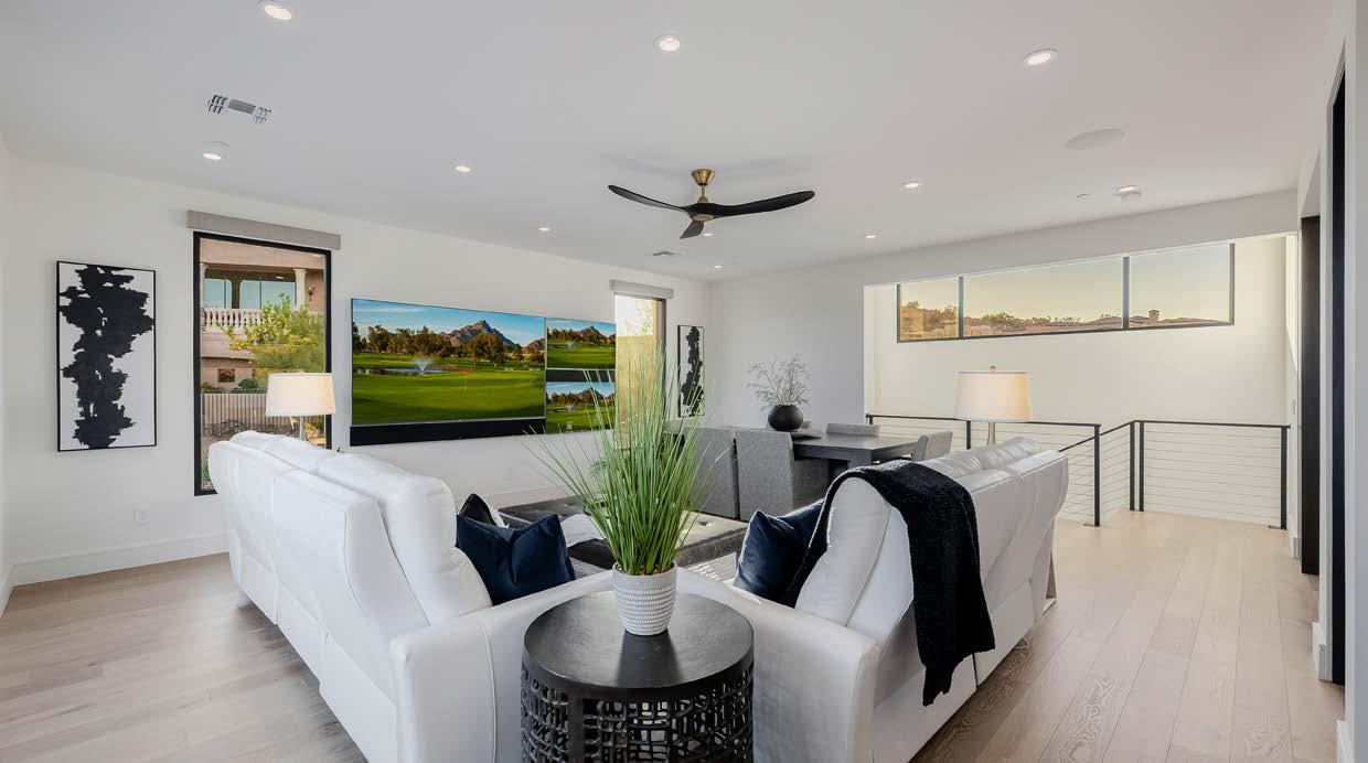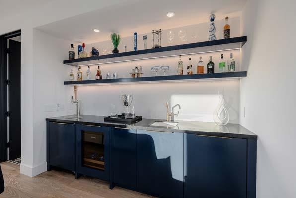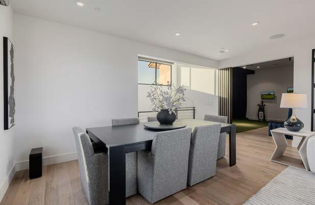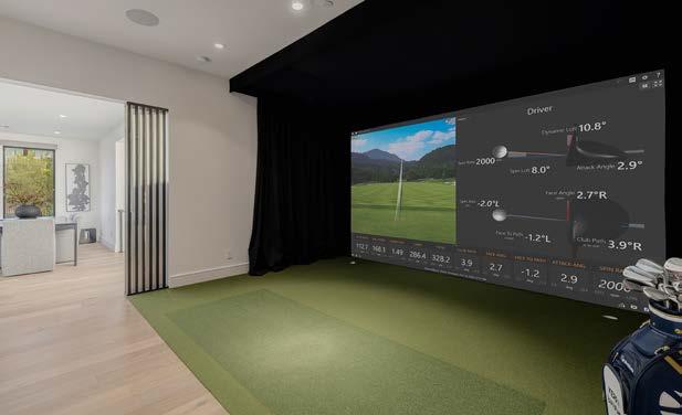 This upstairs entertainment space is a true golfer’s retreat, designed for both play and relaxation. A stylish wet bar features a kegerator, Sub-Zero beverage center, and Asko diswasher. The Trackman golf simulator delivers a professionalgrade practice experience, complete with bench seating for spectators.
