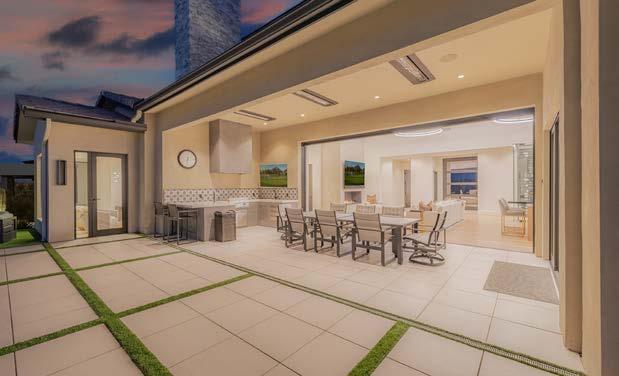 The outdoor entertaining space features a generous covered patio with built-in heaters and a fully equipped outdoor kitchen offering multiple cooking options and a kegerator. Resort-style pool and spa with a striking water feature—ideal for relaxed afternoons, evening gatherings, and taking in the surrounding golf course views.