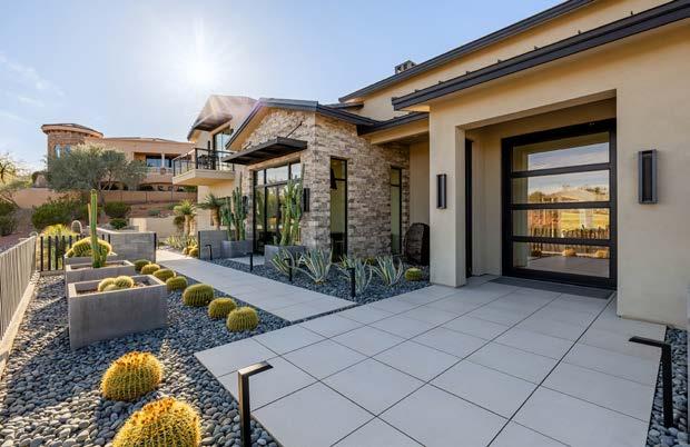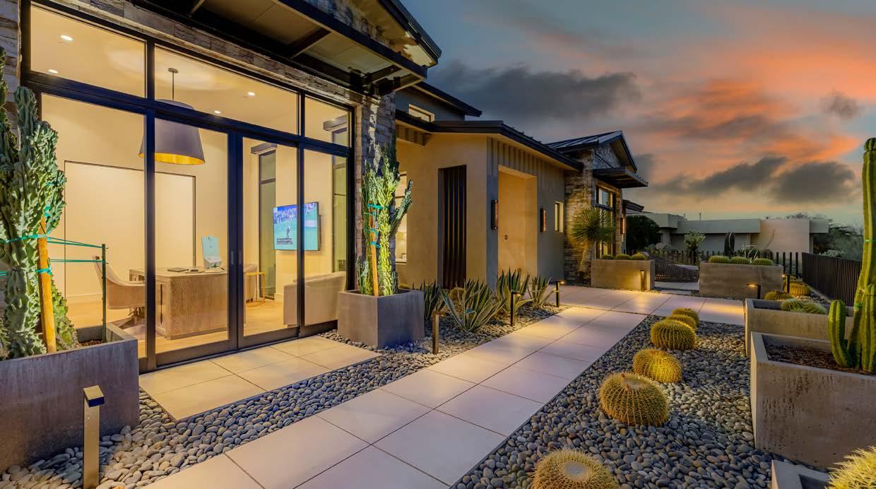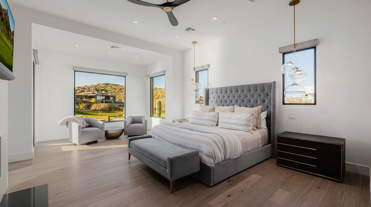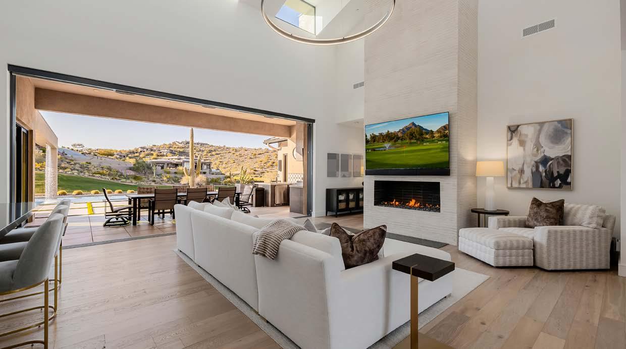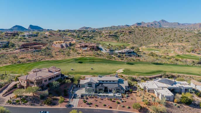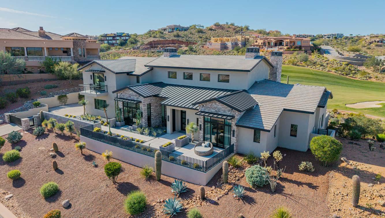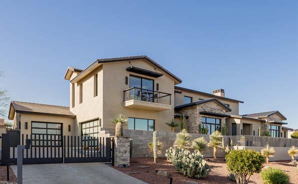 Designed by renowned architect Mark Candelaria, this 2021 custom residence blends clean contemporary lines with timeless desert materials. Every detail reflects thoughtful craftsmanship and modern luxury, set within the gated community of Firerock Country Club. Positioned above the 18th hole, the home captures sweeping golf course vistas framed by surrounding mountains.