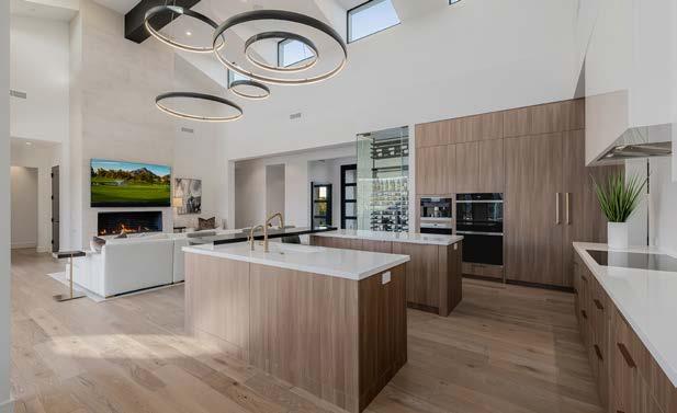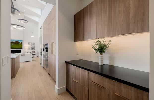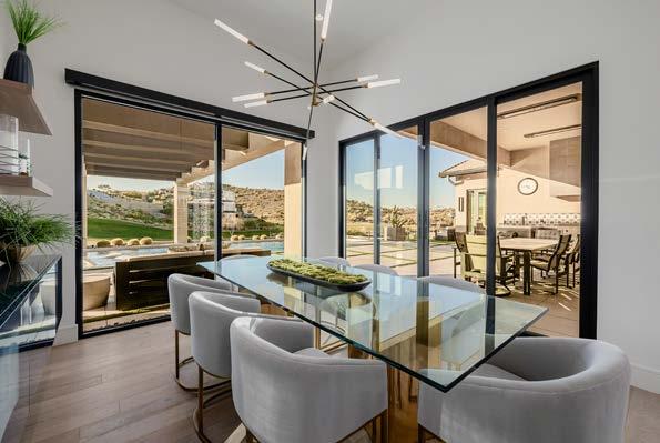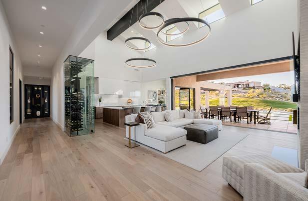 Balancing clean design with warmth, this inviting living area offers a relaxed yet elevated atmosphere. Expansive openings connect the interior to the covered patio, extending the living experience. An eye-catching, glass-enclosed wine display keeps your collection beautifully showcased and close at hand for the perfect dinner pairing.