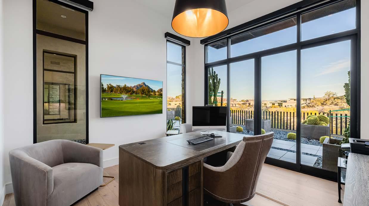 The private office features expansive windows and patio doors that invite natural light and desert views, creating an inspiring work environment. An immaculate three-car garage offers ample storage, while the spacious laundry room is outfitted with custom cabinetry and generous counter space for everyday convenience.