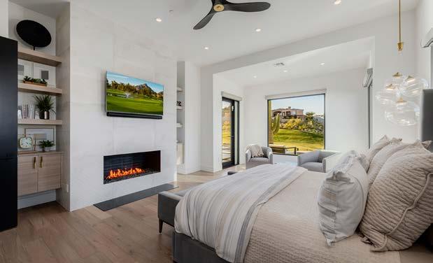 The primary suite is a tranquil sanctuary overlooking the golf course, designed to capture both views and comfort. A sitting area, fireplace, and built-in display shelving create a warm, inviting atmosphere. The spa-inspired bath features a modern design with a soaking tub, glass-enclosed shower, and enviable walk-in closet with built-in cabinets.