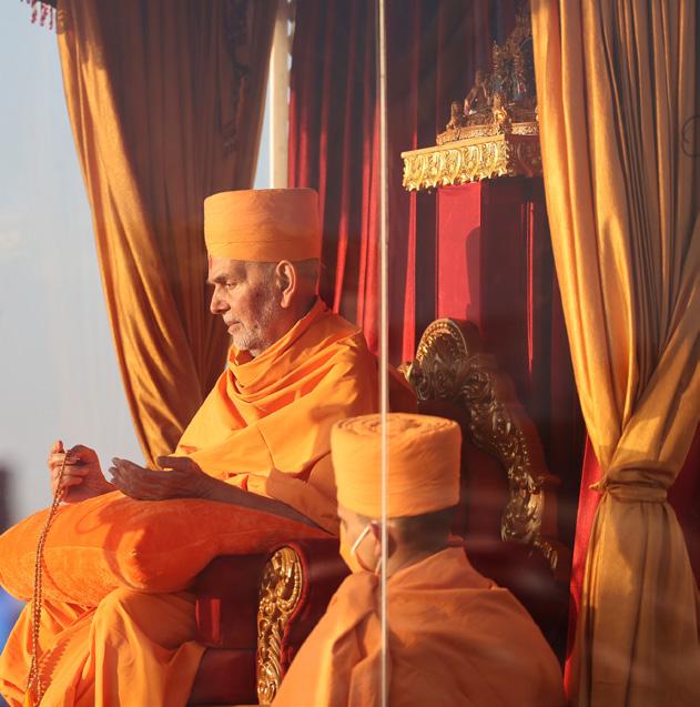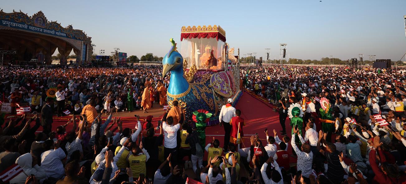 welcome them. The assembly began with the singing of devotional hymns followed by the grand entrance of His Holiness Mahant Swami Maharaj on a decorated chariot. Youths danced on stage to welcome Mahant Swami Maharaj.