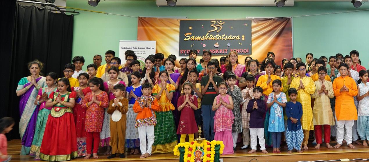 vandana, swaagata bhaashanam (welcome address in Sanskrit and English) and deepa jwalana shlokas by the students. The guests - Mrs Usha Garg, former President of the Rotary Club of Strathfield; Mr Surinder Jain, Vice President, Hindu Council of Australia; Ms Niyati Mehta, Cultural Director, Swami Vivekananda Cultural Centre- kindly lit the lamp and formally initiated the SamskrtotsavaH 2024. The hall then reverberated with the whole school chanting Anjaneya Mangalashtakam and the National anthem in English and Sanskrit. Blessings were also sought from Lord Ganesha and the Devis through an exquisite Bharatanatyam performance
