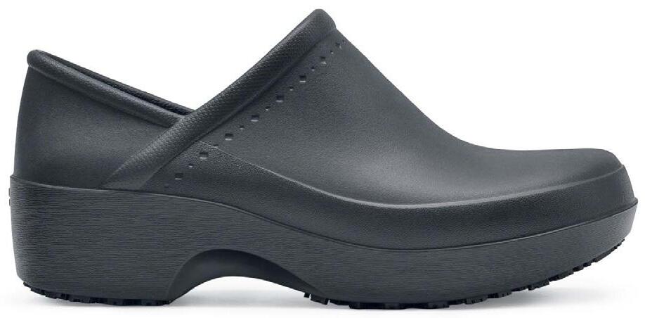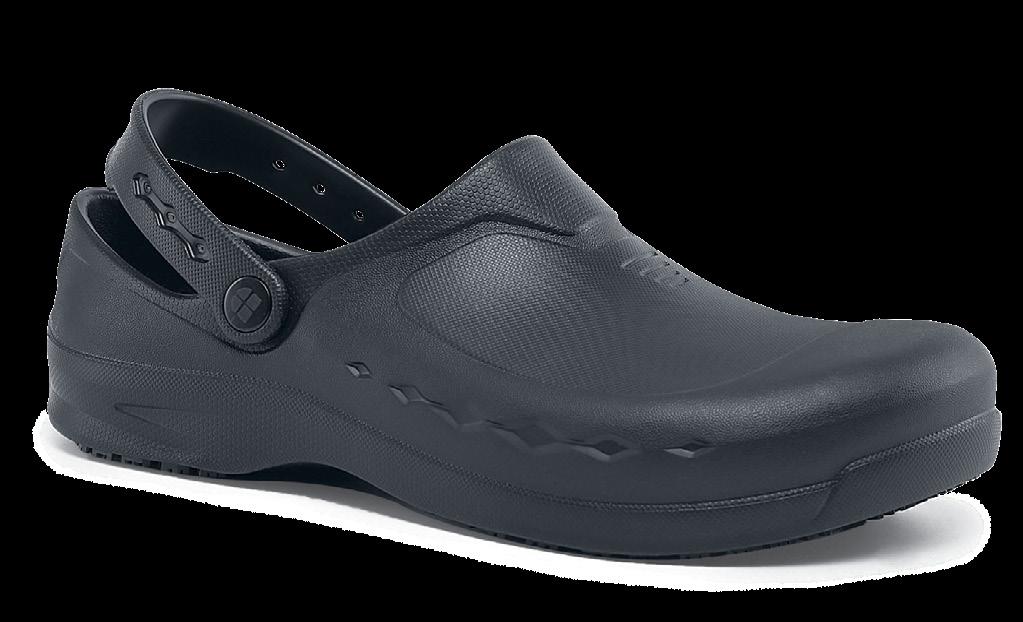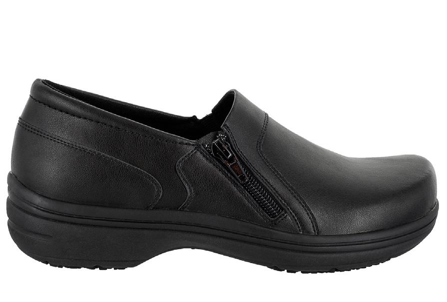 Superior SFC slip resistant outsole. Treated to repel liquids from the surface. Decreased trip hazard zone to allow fluid movement between slippery environments. Easy slip-on style. Water resistant synthetic upper 2 ½” heel. Removable insole. Imported. 117445 (35) Black
