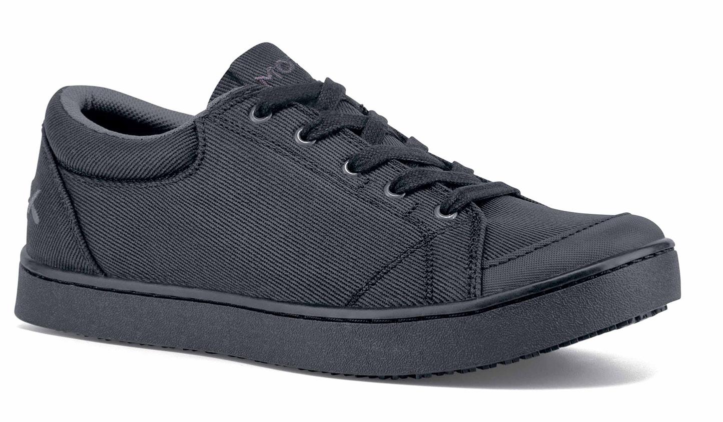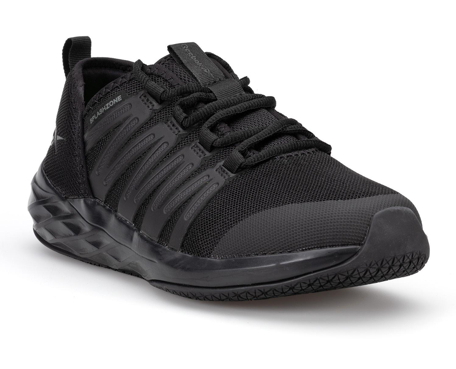Slip resistant. Water resistant. Treated to repel liquids from the surface. TripGuard: decreased trip hazard zone to allow fluid movement between slippery environments. Removable cushioned insoles. Synthetic upper. 117443 (35) Black