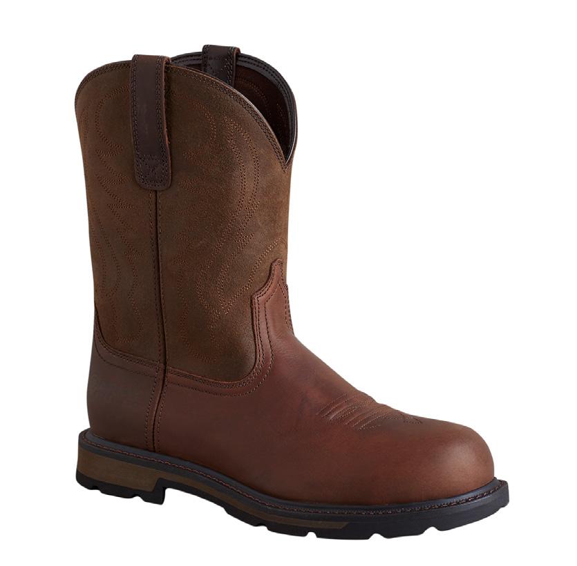 Slip-on convenience meets all-weather versatility and steel toe safety in these rugged 11-inch Wellington boots. Heel and ankle reinforcements add extra support and safety on the ranch. A durable rubber tread sheds mud and holds firm on slippery ground. Imported.
