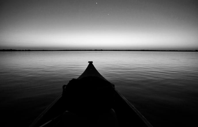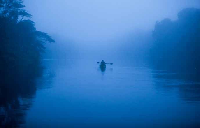 há folhas dançando no ar e caindo lentamente na superfície do riacho, dando voltas desorientadas quando um bando de garças bate asas e sai da floresta voando em direção ao riacho. As garças pai ram por algum tempo antes de sacudirem fortemente as asas e se lançarem para as montanhas feito flecha desvanecente na leve coloração das montanhas.
